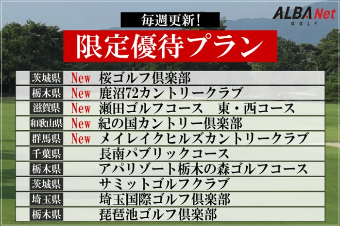 2026年4月9日 (木) 06時00分17月までのプレーで使える!関東&関西&中部&東北エリア対象34コース限定の1,500円分クーポン配布中!