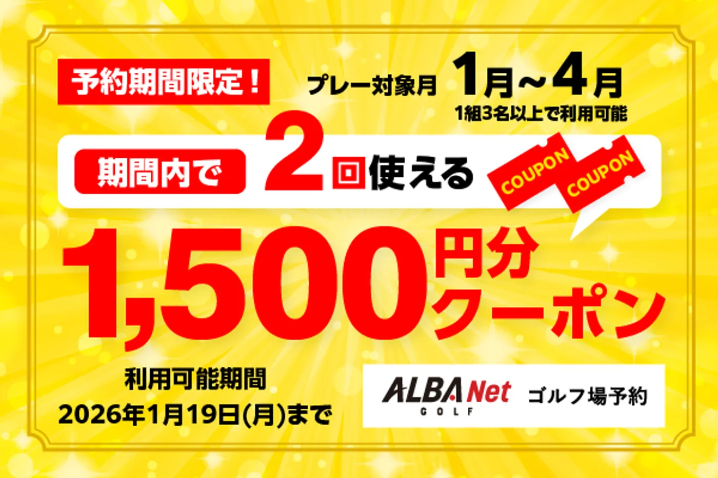 2026年1月16日 (金) 06時00分14月までのプレーに使える!対象コース限定3,000円分クーポン配布中!