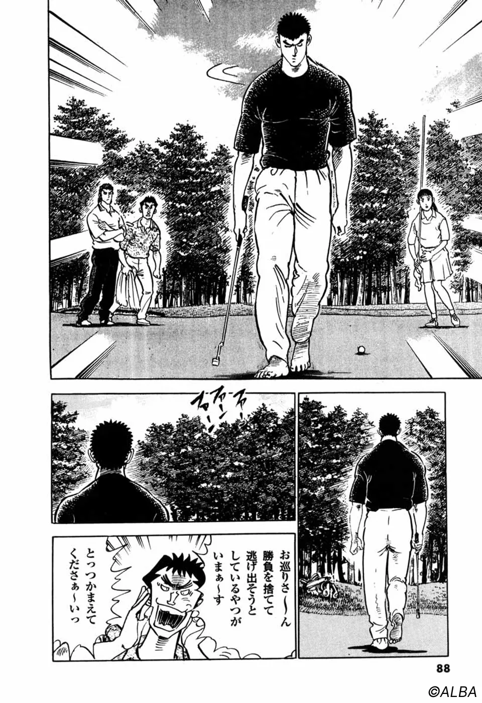 【前巻までのあらすじ】鳴海一丸は、流れの研師として東京・浅草にやって来た。ひょんなことからゴルフクラブを握った一丸は、ボールを二つに割る豪快なショットを叩き出し、才能を仙道桂に見込まれる。頑なにゴルフをけなし拒む一丸だが、それに腹を立てた日本アマチャンプの御園は桂を賭けたゴルフ対決を申し込む。御園の優勢で始まった試合だが、一丸は「職人の目」で相手のショットを盗み、ジリジリと追いつめる。御園は焦り、ペースを乱すが、やがて己を取り戻しスコアを引き離しにかかる…。