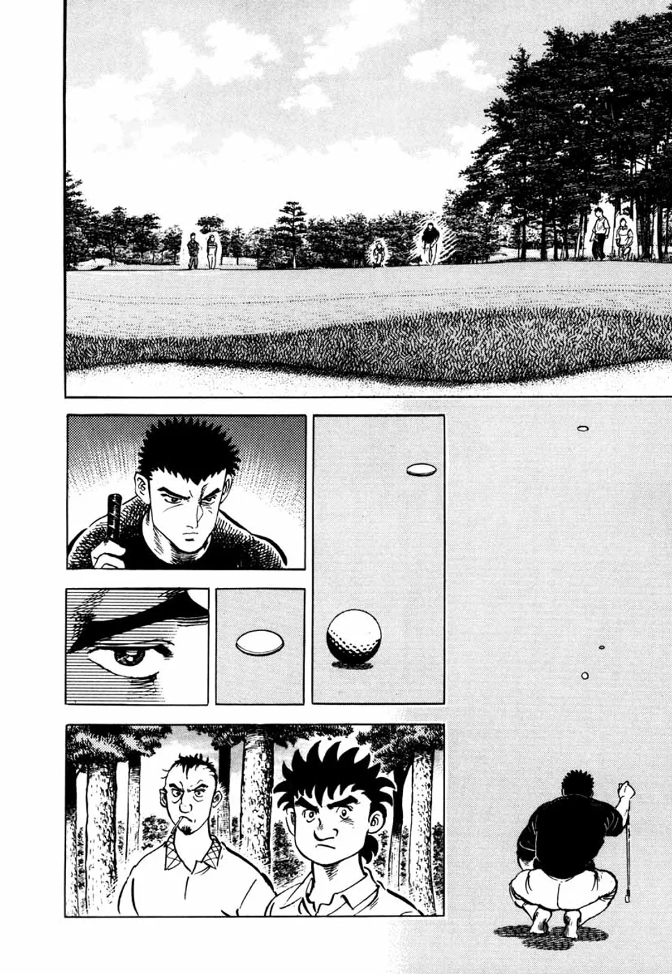 【前巻までのあらすじ】元刀鍛冶師だった一丸は、浅草に来て、桂に才能を見込まれ、初めてゴルフクラブを握る。日本アマチャンピオンの御園や山中プロらとの対戦では「目でショットを盗む」職人技と天性の才能を見せ、周囲の度肝を抜いた。今度は、互いに才能を持ちながらも日の浅い素人同士の一平とのマッチプレー対決。正確な距離を刻み、リードする一平に対し、コースレイアウトに苦しむ一丸だったが、設計者のだましの技術にふれ、いままでゴルフを軽く思っていた自分を知り、心から「礼」をする。