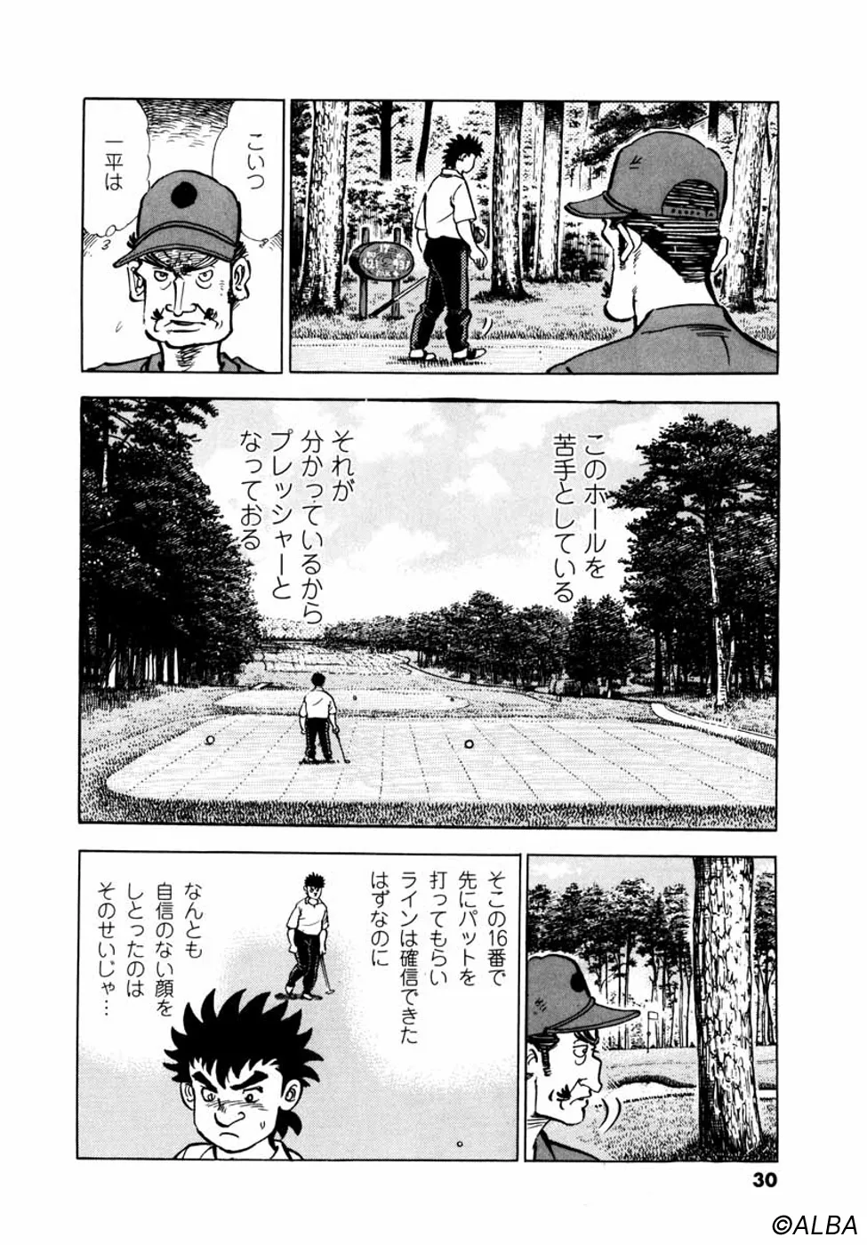 【前巻までのあらすじ】元刀鍛冶師だった一丸は、浅草に来て、桂に才能を見込まれ、初めてゴルフクラブを握る。日本アマチャンピオンの御園や山中プロらとの対戦では「目でショットを盗む」職人技と天性の才能を見せ、周囲の度肝を抜いた。今度は、互いに才能を持ちながらも日の浅い素人同士の一平とのマッチプレー対決。正確な距離を刻み、リードする一平に対し、コースレイアウトに苦しむ一丸だったが、設計者のだましの技術にふれ、いままでゴルフを軽く思っていた自分を知り、心から「礼」をする。