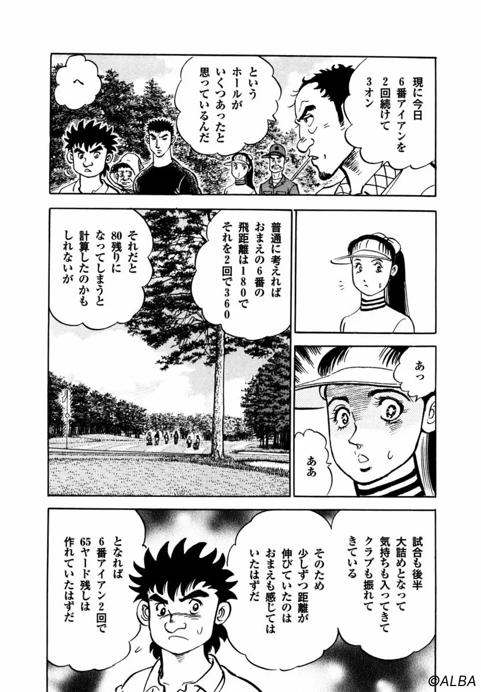【前巻までのあらすじ】元刀鍛冶師だった一丸は、浅草に来て、桂に才能を見込まれ、初めてゴルフクラブを握る。日本アマチャンピオンの御園や山中プロらとの対戦では「目でショットを盗む」職人技と天性の才能を見せ、周囲の度肝を抜いた。今度は、互いに才能を持ちながらも日の浅い素人同士の一平とのマッチプレー対決。正確な距離を刻み、リードする一平に対し、コースレイアウトに苦しむ一丸だったが、設計者のだましの技術にふれ、いままでゴルフを軽く思っていた自分を知り、心から「礼」をする。
