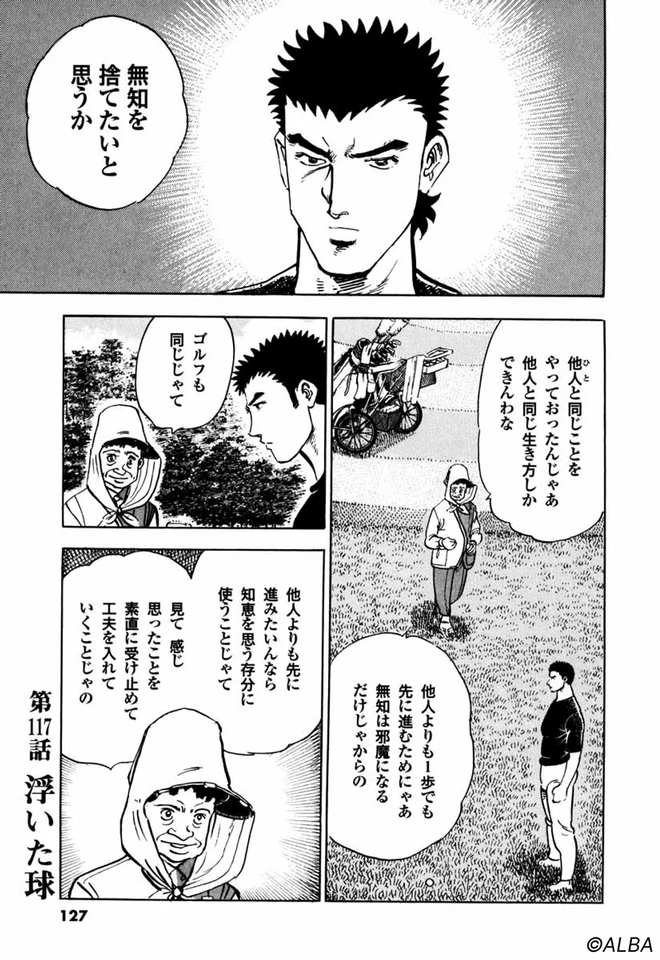 【前巻までのあらすじ】元刀鍛冶師だった一丸は、浅草に来て、桂に才能を見込まれ、初めてゴルフクラブを握る。日本アマチャンピオンの御園や山中プロらとの対戦では「目でショットを盗む」職人技と天性の才能を見せ、周囲の度肝を抜いた。今度は、互いに才能を持ちながらも日の浅い素人同士の一平とのマッチプレー対決。正確な距離を刻み、リードする一平に対し、コースレイアウトに苦しむ一丸だったが、設計者のだましの技術にふれ、いままでゴルフを軽く思っていた自分を知り、心から「礼」をする。