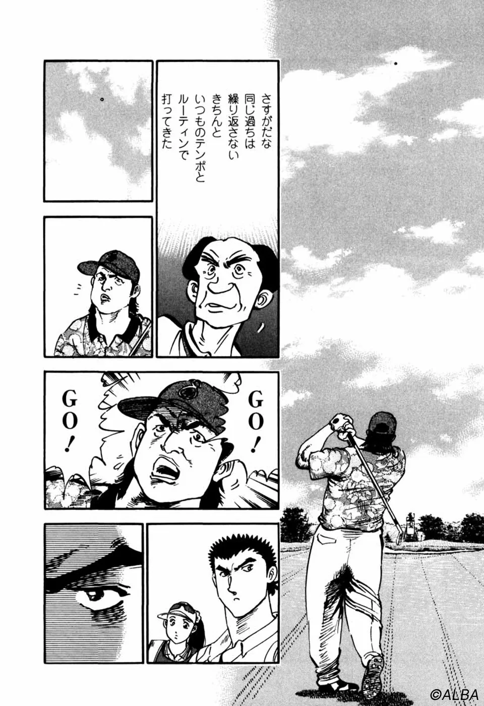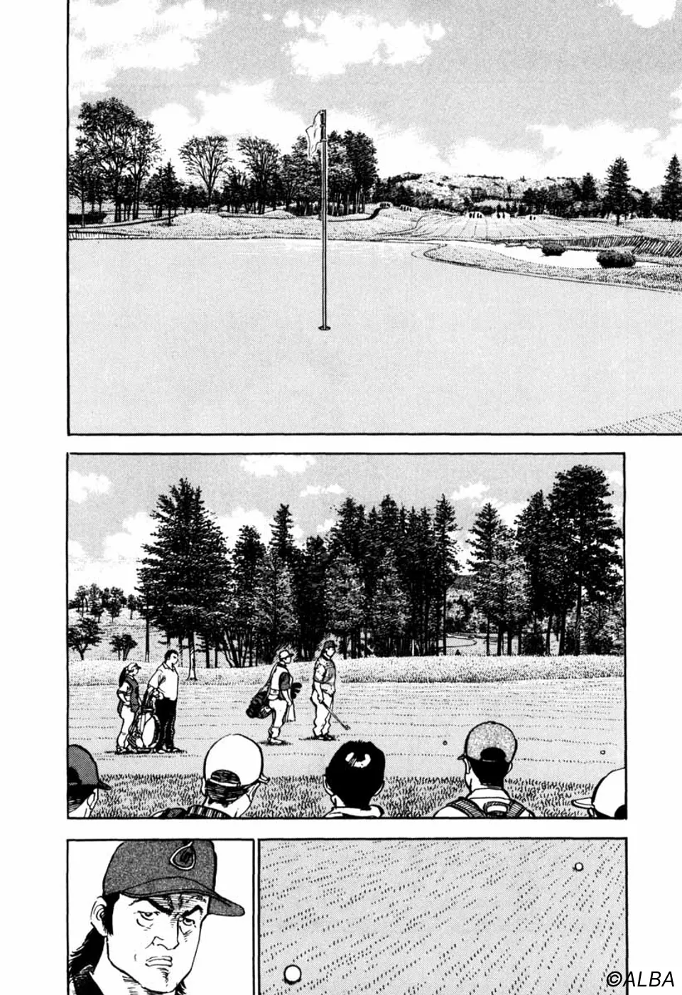 【前巻までのあらすじ】ミズオクラシック3日目、一丸はマッチプレーを仕掛けてきたジャンボ尾関から賭けを持ちかけされ、ジャンボが勝ったら一丸が刀鍛冶師時代に長年打ち込んで今なお作り上げることが出来ない古名刀の写しを作ること、一丸が勝ったらジャンボがプロゴルフ界を引退することを了承する。つまり、どちらかがゴルフをやめなくてはならないのだ。ジャンボの繰り出す「プロの技」に対し、向上心で追う一丸、互いに真剣勝負をおこなうなか、ジャンボを不審に思った桂はルール違反を犯し、試合中にご隠居に電話し、情報を求める。