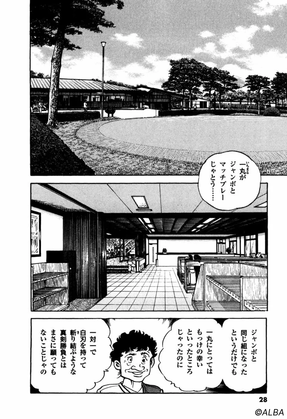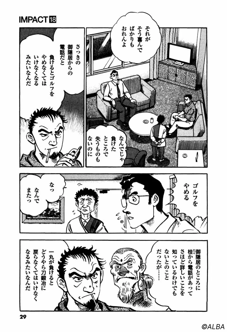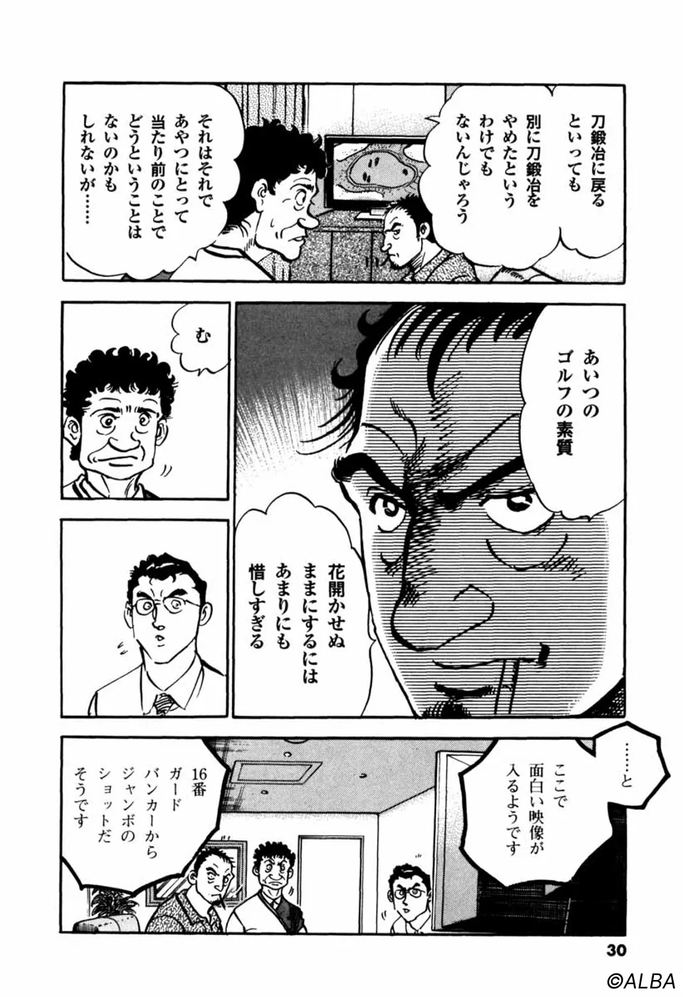 【前巻までのあらすじ】ミズオクラシック3日目、一丸はマッチプレーを仕掛けてきたジャンボ尾関から賭けを持ちかけされ、ジャンボが勝ったら一丸が刀鍛冶師時代に長年打ち込んで今なお作り上げることが出来ない古名刀の写しを作ること、一丸が勝ったらジャンボがプロゴルフ界を引退することを了承する。つまり、どちらかがゴルフをやめなくてはならないのだ。ジャンボの繰り出す「プロの技」に対し、向上心で追う一丸、互いに真剣勝負をおこなうなか、ジャンボを不審に思った桂はルール違反を犯し、試合中にご隠居に電話し、情報を求める。