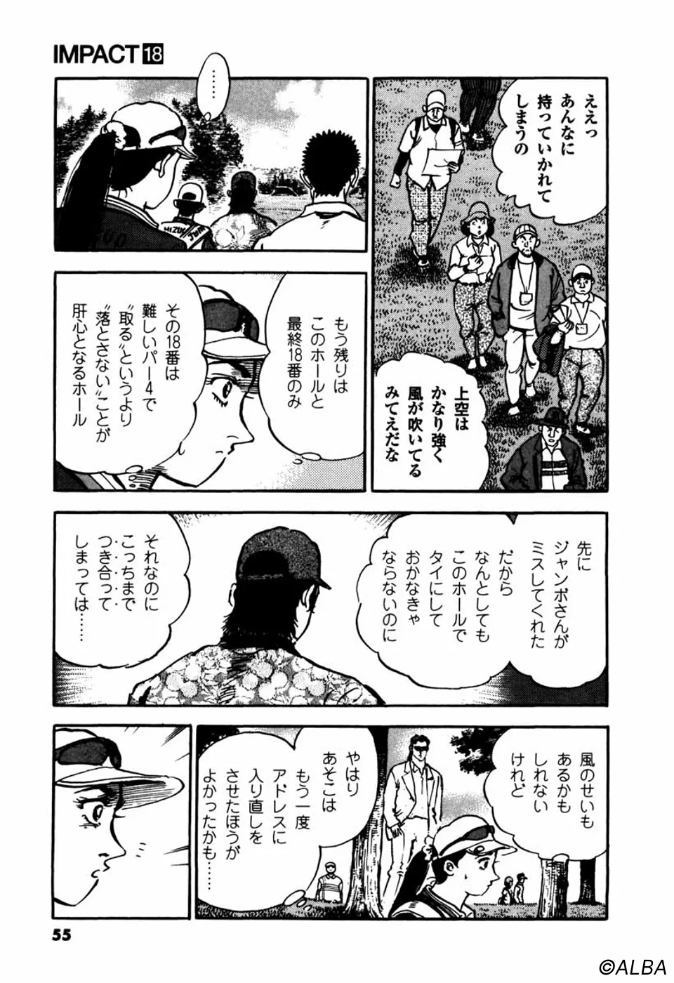 【第18巻あらすじ】ジャンボ尾関VS.鳴海一丸のゴルフ真剣勝負がついに決着。ストロークプレーのプロトーナメントであるにもかかわらず、二人の対決にギャラリーも大興奮。最終18番ホールにジャンボの、一丸の、男の意地が激突。ゴルフの醍醐味が満載の刊。