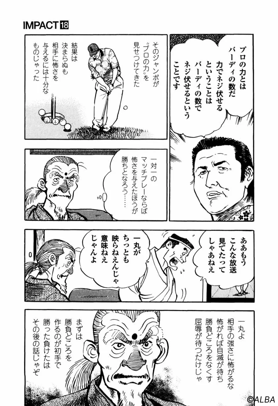 【第18巻あらすじ】ジャンボ尾関VS.鳴海一丸のゴルフ真剣勝負がついに決着。ストロークプレーのプロトーナメントであるにもかかわらず、二人の対決にギャラリーも大興奮。最終18番ホールにジャンボの、一丸の、男の意地が激突。ゴルフの醍醐味が満載の刊。