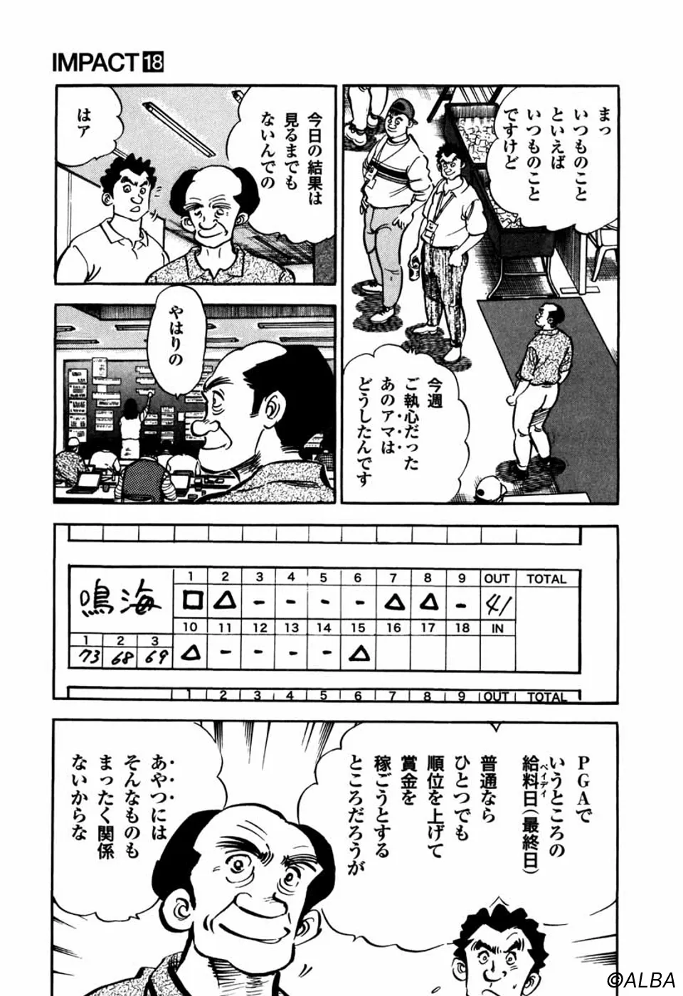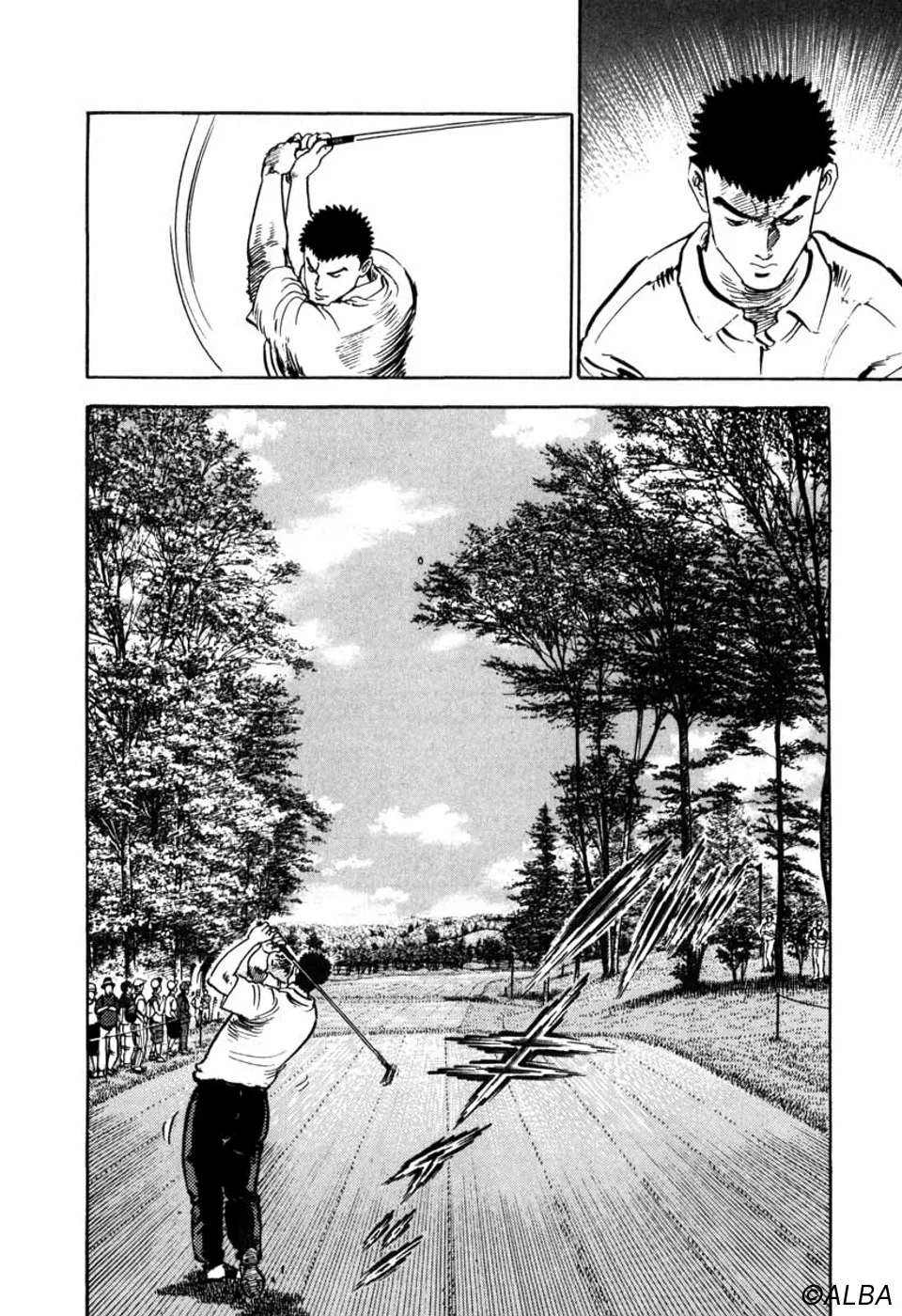 【前巻までのあらすじ】ミズオクラシック3日目、一丸はマッチプレーを仕掛けてきたジャンボ尾関から賭けを持ちかけされ、ジャンボが勝ったら一丸が刀鍛冶師時代に長年打ち込んで今なお作り上げることが出来ない古名刀の写しを作ること、一丸が勝ったらジャンボがプロゴルフ界を引退することを了承する。つまり、どちらかがゴルフをやめなくてはならないのだ。ジャンボの繰り出す「プロの技」に対し、向上心で追う一丸、互いに真剣勝負をおこなうなか、ジャンボを不審に思った桂はルール違反を犯し、試合中にご隠居に電話し、情報を求める。