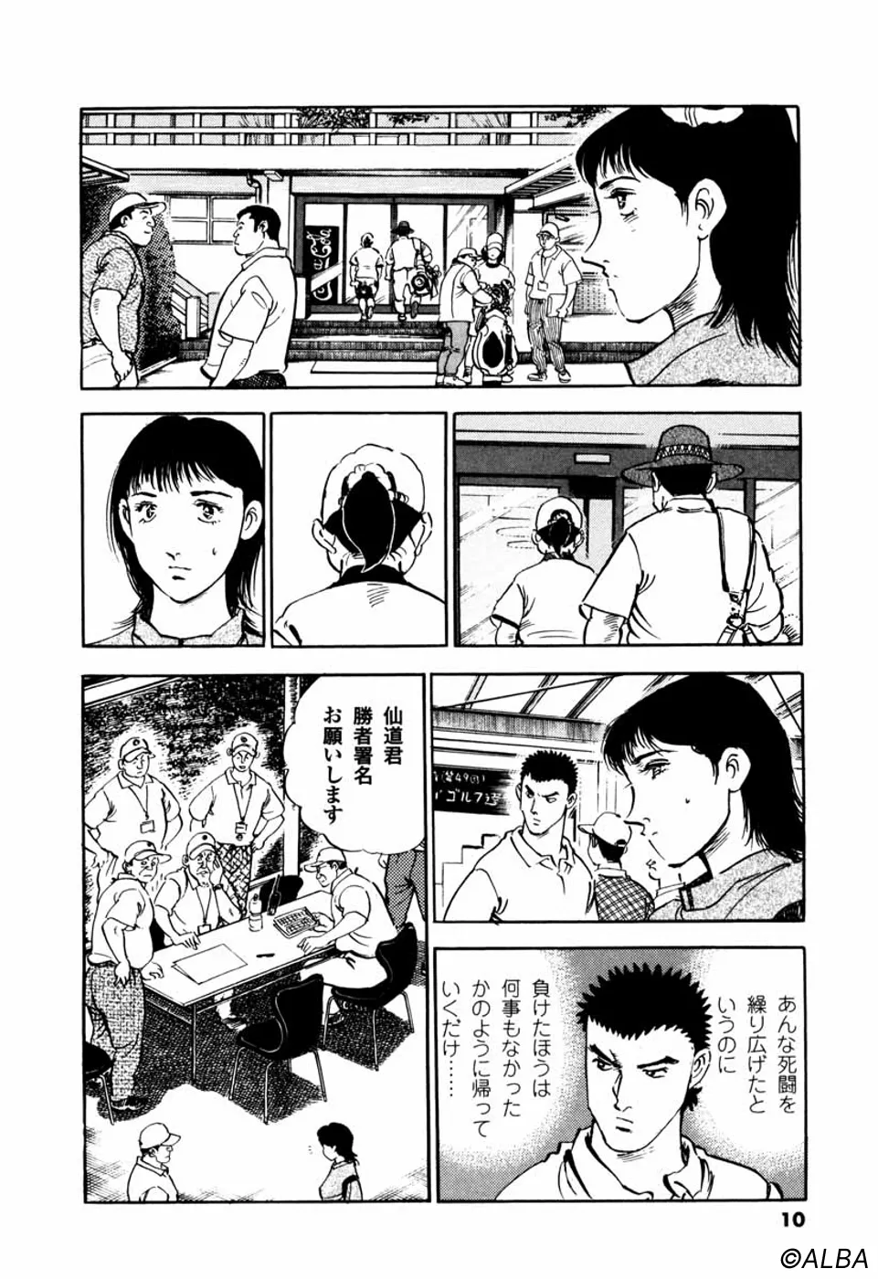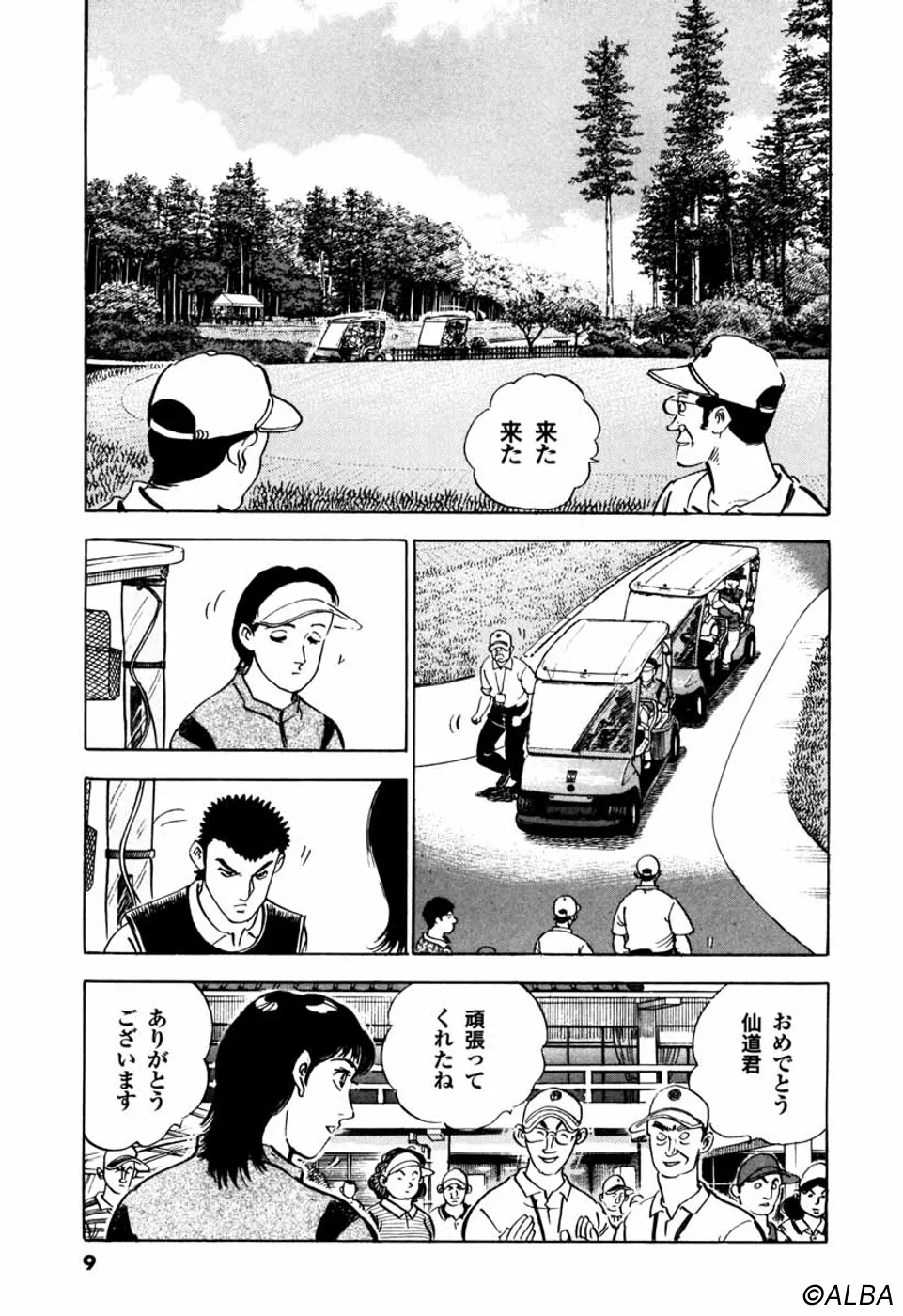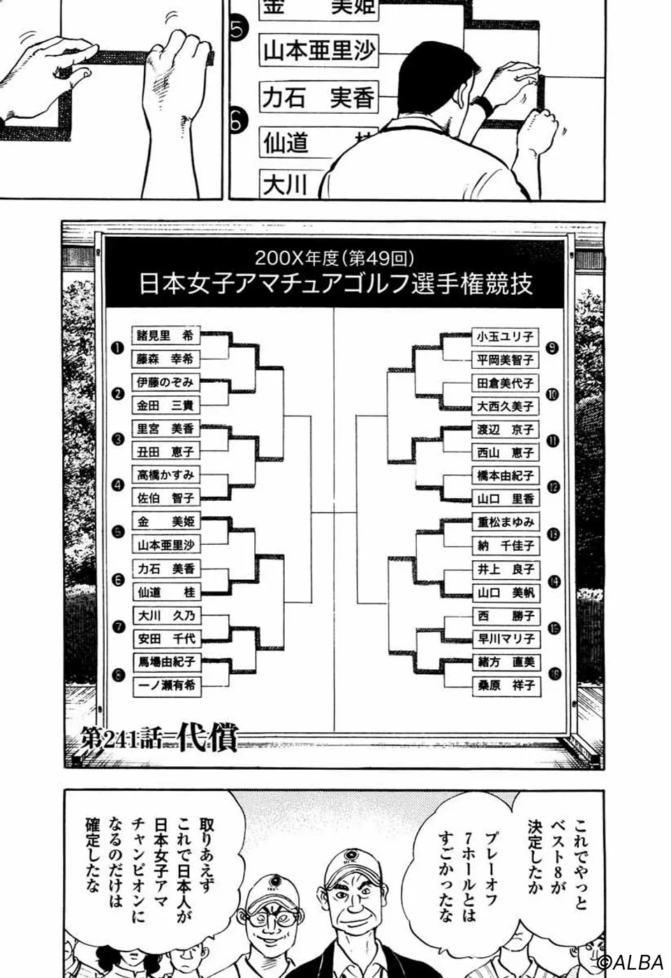 【第25巻あらすじ】韓国女子アマチャンピオン・金美姫をプレーオフ7ホール目で破り、日本女子アマでベスト8に進出した仙道桂。キャディの一丸もマッチプレーの切るか切られるかの雰囲気に気合いが乗ってきた。次なる相手は大ベテランの安田千代。マッチプレーの熱戦は続く。