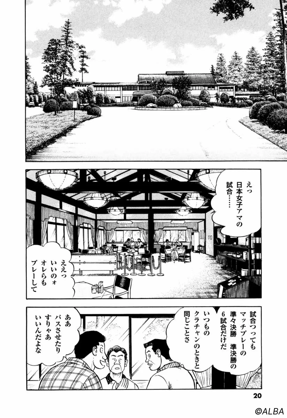 【第25巻あらすじ】韓国女子アマチャンピオン・金美姫をプレーオフ7ホール目で破り、日本女子アマでベスト8に進出した仙道桂。キャディの一丸もマッチプレーの切るか切られるかの雰囲気に気合いが乗ってきた。次なる相手は大ベテランの安田千代。マッチプレーの熱戦は続く。