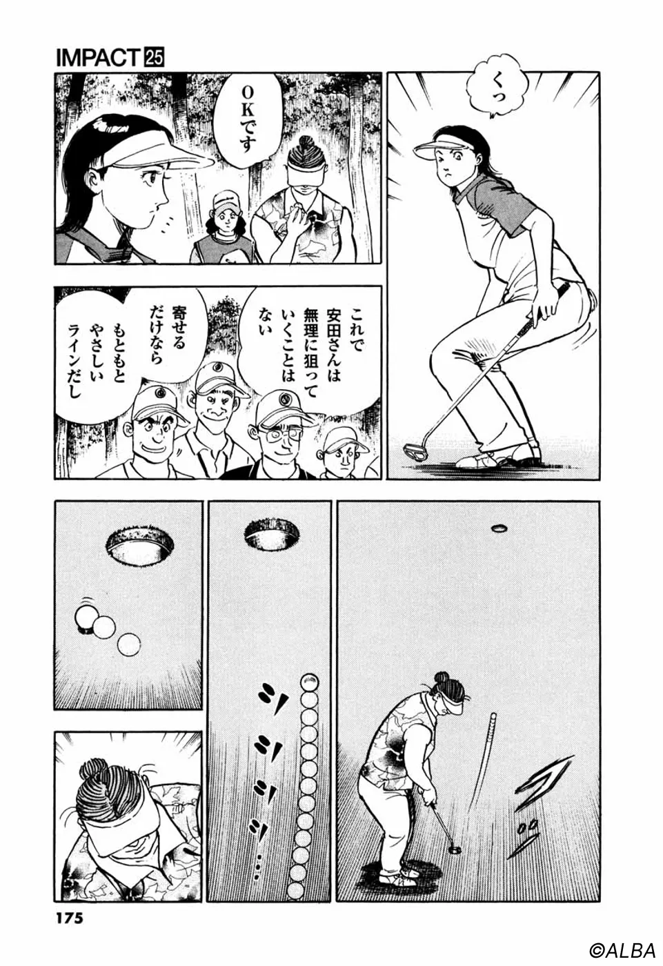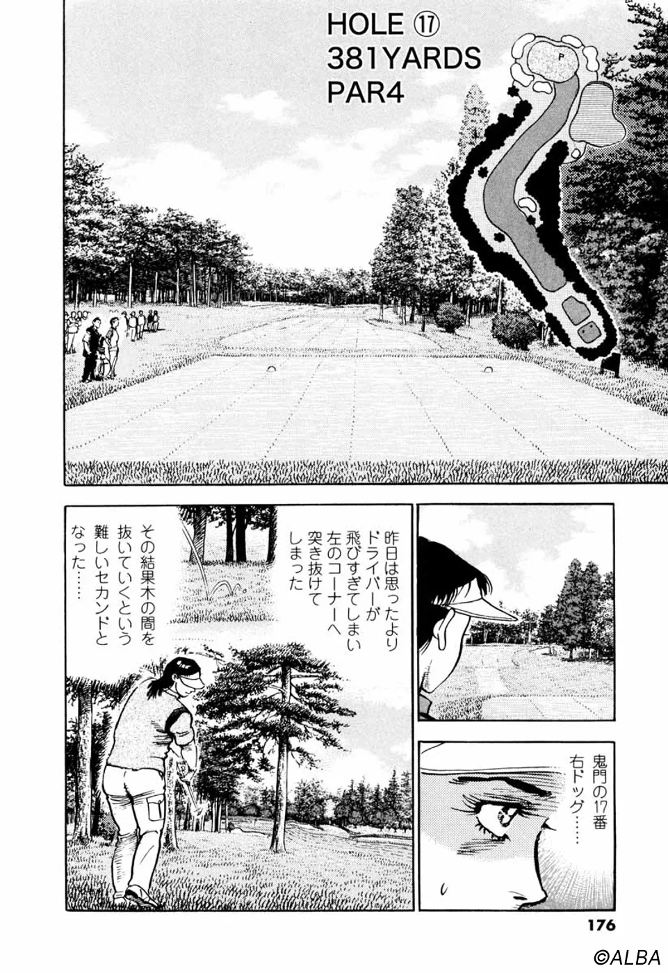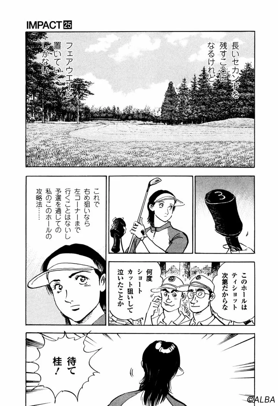 【第25巻あらすじ】韓国女子アマチャンピオン・金美姫をプレーオフ7ホール目で破り、日本女子アマでベスト8に進出した仙道桂。キャディの一丸もマッチプレーの切るか切られるかの雰囲気に気合いが乗ってきた。次なる相手は大ベテランの安田千代。マッチプレーの熱戦は続く。