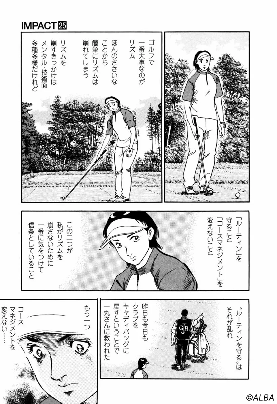 【第25巻あらすじ】韓国女子アマチャンピオン・金美姫をプレーオフ7ホール目で破り、日本女子アマでベスト8に進出した仙道桂。キャディの一丸もマッチプレーの切るか切られるかの雰囲気に気合いが乗ってきた。次なる相手は大ベテランの安田千代。マッチプレーの熱戦は続く。