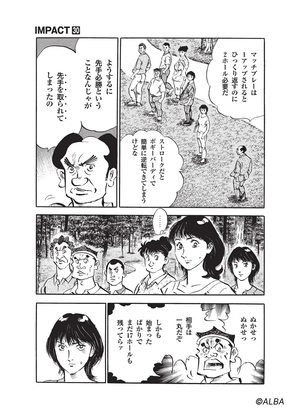 【第30巻あらすじ】日本アマチュア選手権予選。キャディを務めた一平の「クラブ超過」というミスにより、4罰打という重いハンディを背負うことになる。思わぬ苦戦を強いられることとなった一丸だったが、その後スコアを縮めていき決勝を賭けたプレーオフへと進出する。