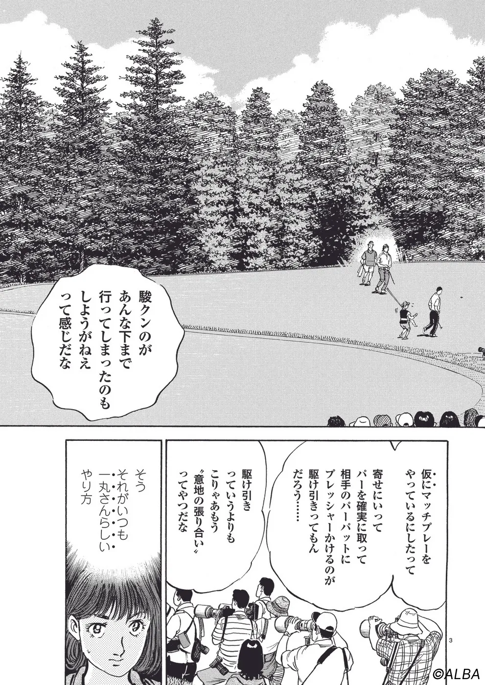 【第44巻あらすじ】日本オープン三日目。完全にマッチプレーの様相を呈してきた一丸と速水のライバル対決。お互いが持っている技を惜しみなく出し合い、無謀ともいえるクラブ選択や強気のパッティングの応酬など、一進一退の攻防を繰り広げる。