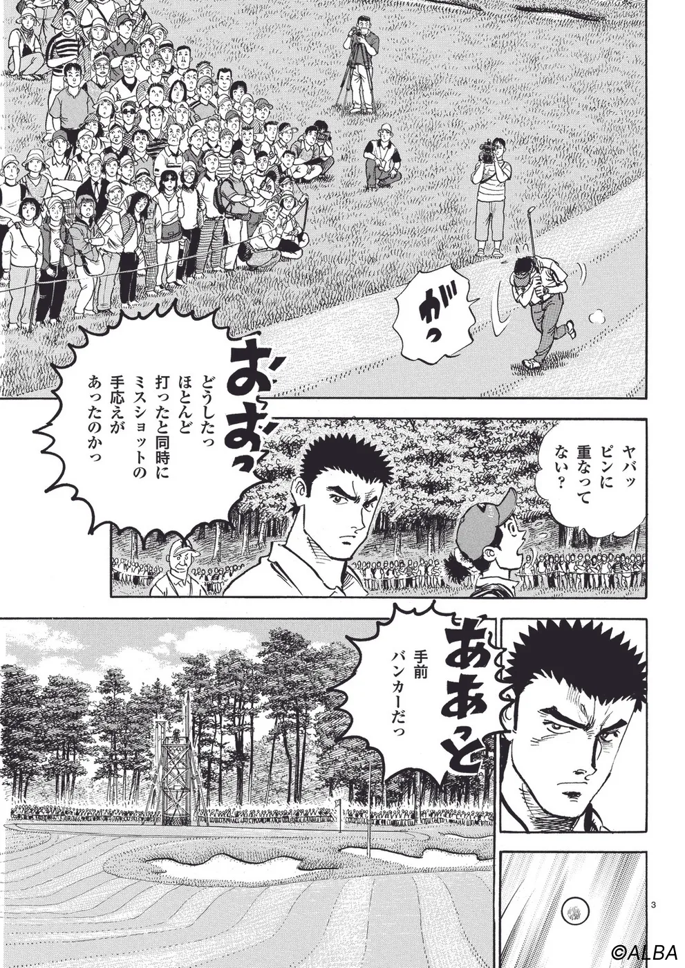 【第44巻あらすじ】日本オープン三日目。完全にマッチプレーの様相を呈してきた一丸と速水のライバル対決。お互いが持っている技を惜しみなく出し合い、無謀ともいえるクラブ選択や強気のパッティングの応酬など、一進一退の攻防を繰り広げる。