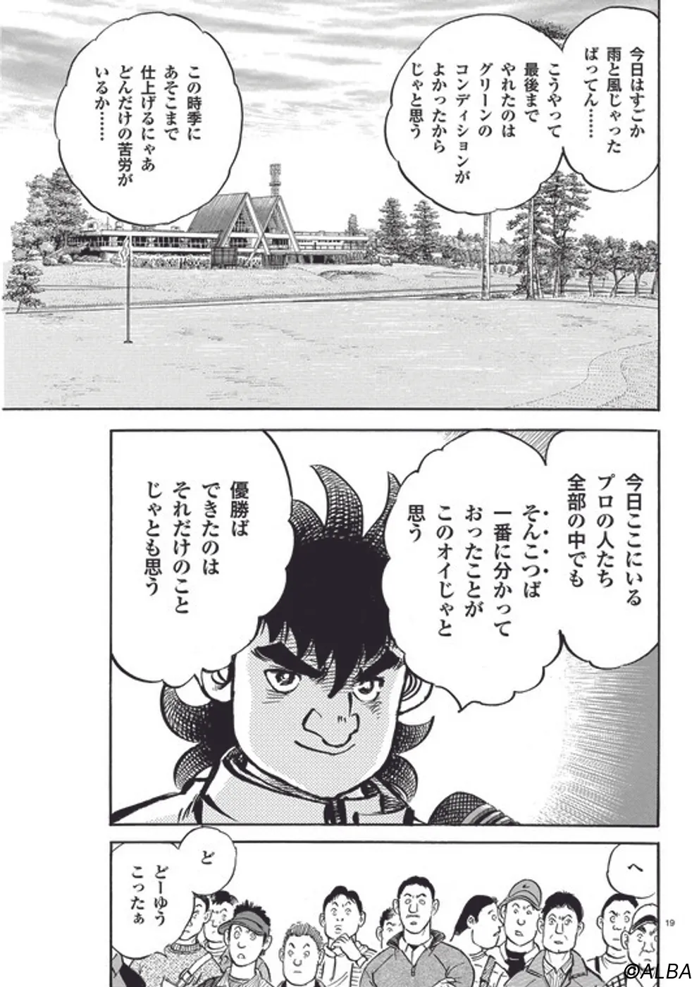 【第49巻あらすじ】プロとしての道を歩み始めた一平、初戦となるチャレンジトーナメントに挑むことに。グリーンキーパーとしての知識に加え、大茨城GCで鍛えた小技を武器に飛ばし屋たちと対等に渡り合う。大荒れの天候も重なり、大波乱となった試合を制するのは一体!?