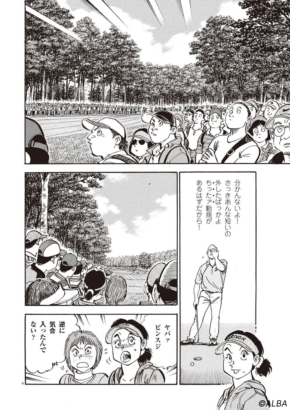 【第64巻あらすじ】スーパーアマチュア・松井英樹とのペアリングとなったAONオープン最終日。序盤から飛ばす二人は一進一退の攻防を繰り広げながらどんどんスコアを伸ばしていく。いつの間にか優勝争いに食い込んでいるのだが、お互いのプレーしか目に入っていないようなプレーが続く。