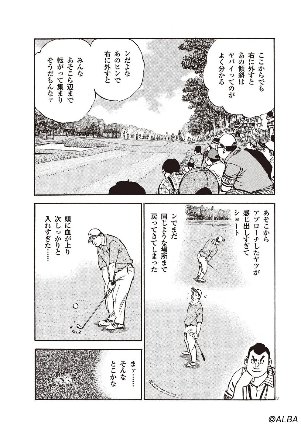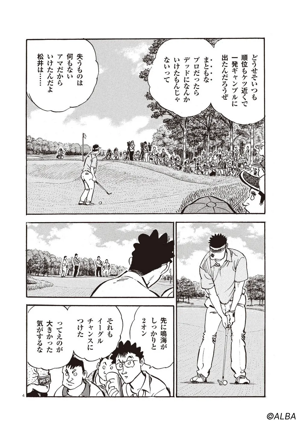 【第64巻あらすじ】スーパーアマチュア・松井英樹とのペアリングとなったAONオープン最終日。序盤から飛ばす二人は一進一退の攻防を繰り広げながらどんどんスコアを伸ばしていく。いつの間にか優勝争いに食い込んでいるのだが、お互いのプレーしか目に入っていないようなプレーが続く。