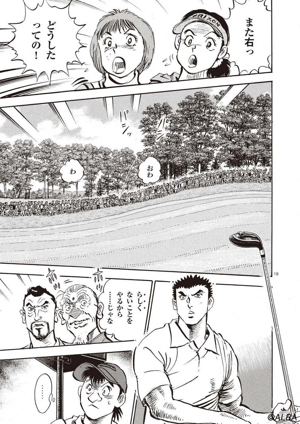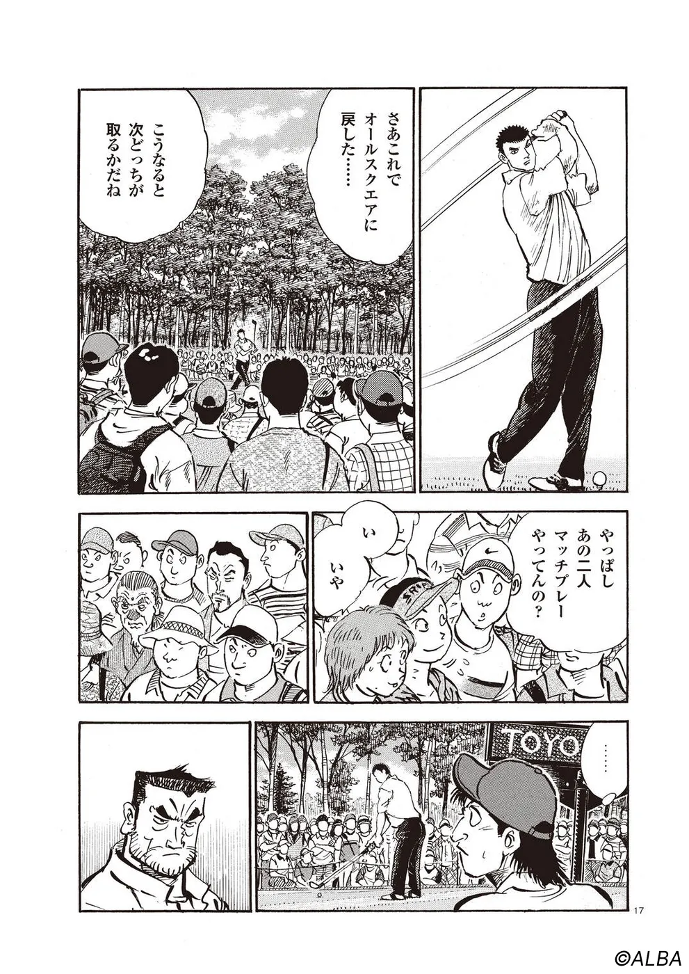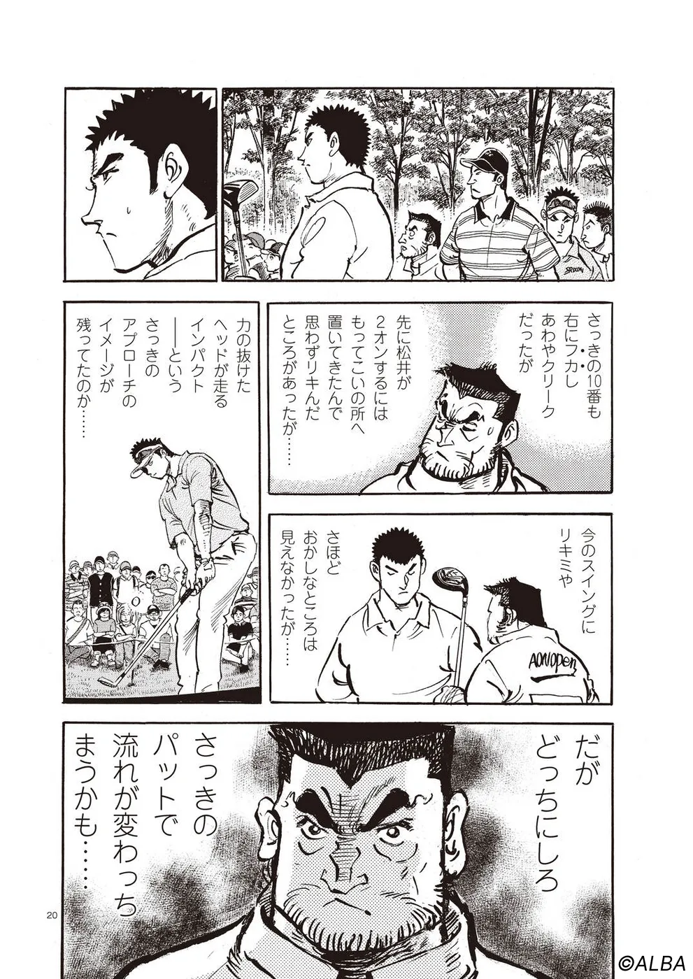 【第64巻あらすじ】スーパーアマチュア・松井英樹とのペアリングとなったAONオープン最終日。序盤から飛ばす二人は一進一退の攻防を繰り広げながらどんどんスコアを伸ばしていく。いつの間にか優勝争いに食い込んでいるのだが、お互いのプレーしか目に入っていないようなプレーが続く。