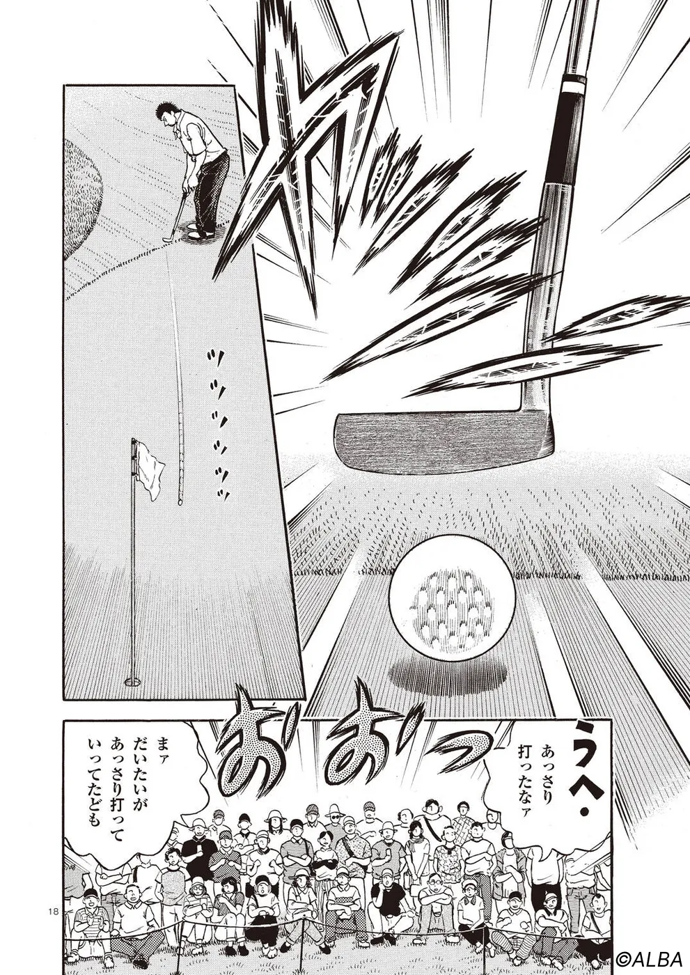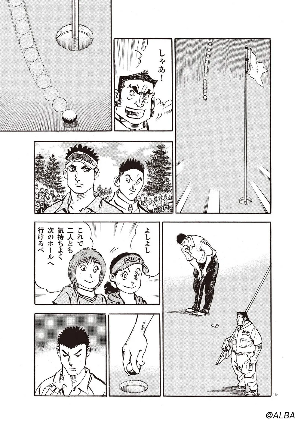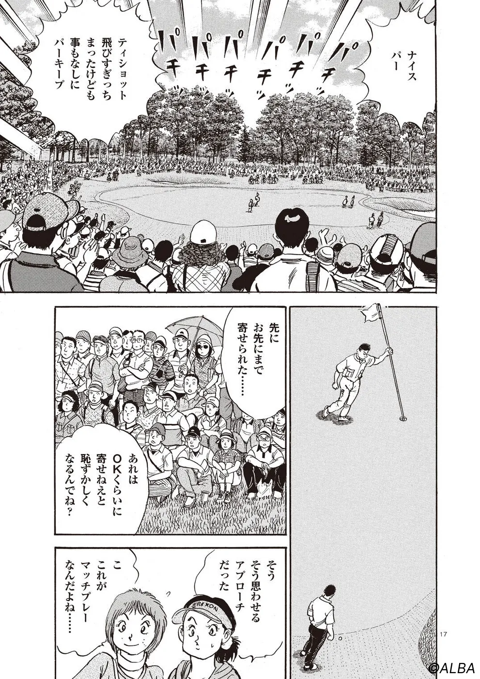 【第64巻あらすじ】スーパーアマチュア・松井英樹とのペアリングとなったAONオープン最終日。序盤から飛ばす二人は一進一退の攻防を繰り広げながらどんどんスコアを伸ばしていく。いつの間にか優勝争いに食い込んでいるのだが、お互いのプレーしか目に入っていないようなプレーが続く。