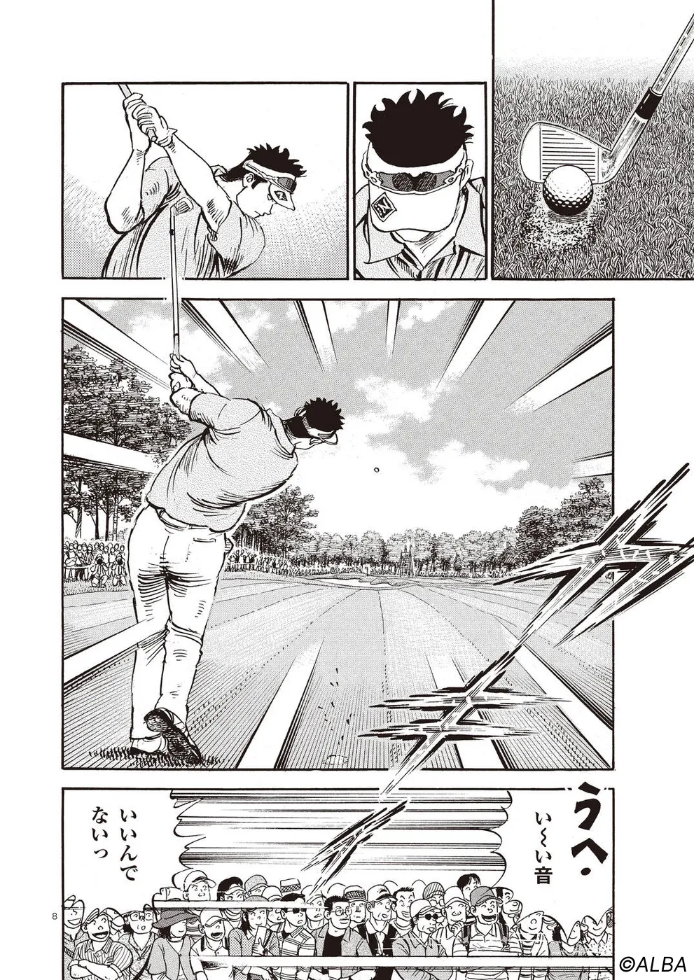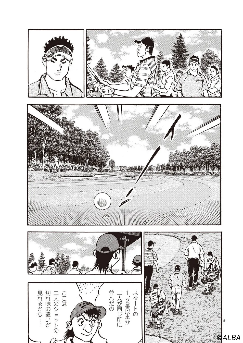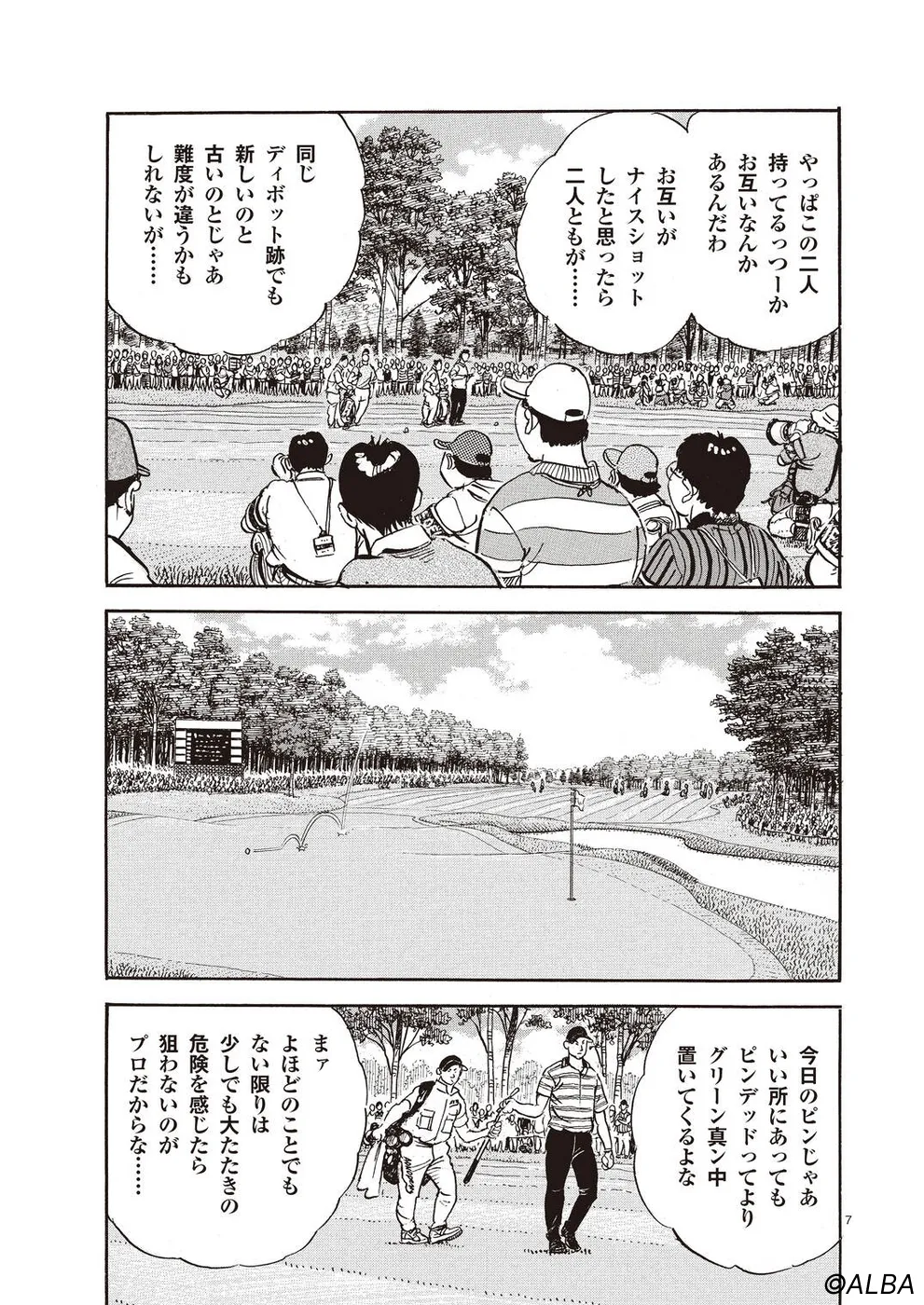 【第64巻あらすじ】スーパーアマチュア・松井英樹とのペアリングとなったAONオープン最終日。序盤から飛ばす二人は一進一退の攻防を繰り広げながらどんどんスコアを伸ばしていく。いつの間にか優勝争いに食い込んでいるのだが、お互いのプレーしか目に入っていないようなプレーが続く。