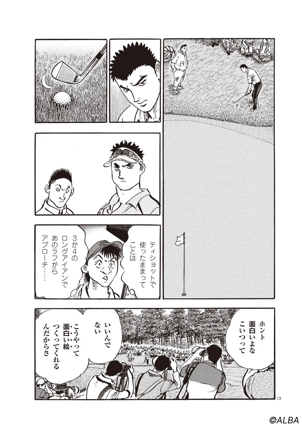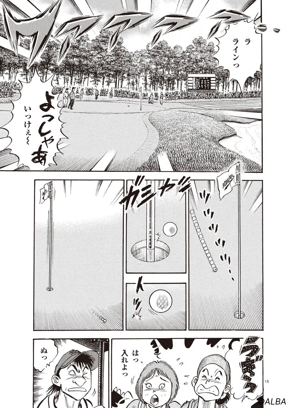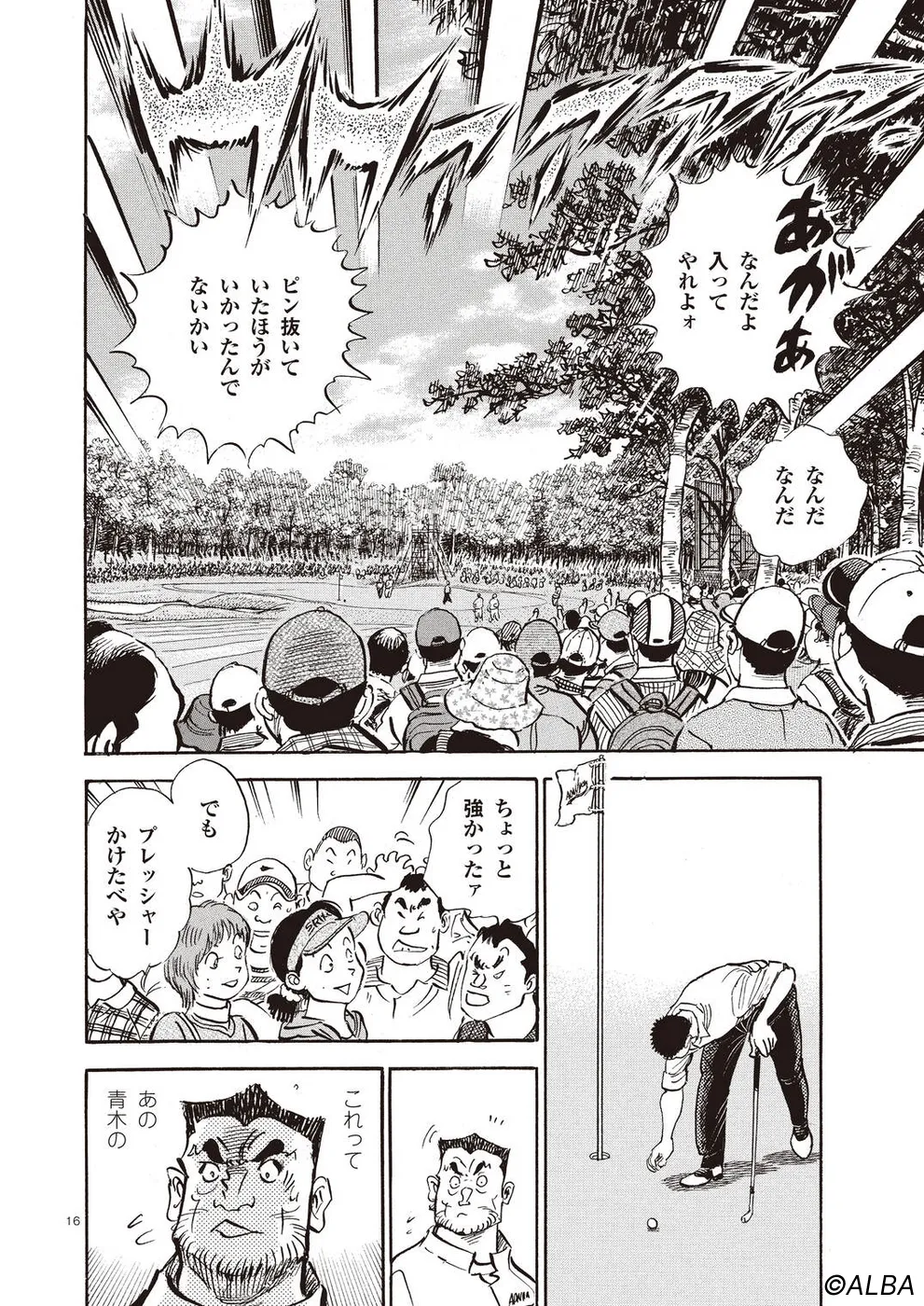 【第64巻あらすじ】スーパーアマチュア・松井英樹とのペアリングとなったAONオープン最終日。序盤から飛ばす二人は一進一退の攻防を繰り広げながらどんどんスコアを伸ばしていく。いつの間にか優勝争いに食い込んでいるのだが、お互いのプレーしか目に入っていないようなプレーが続く。