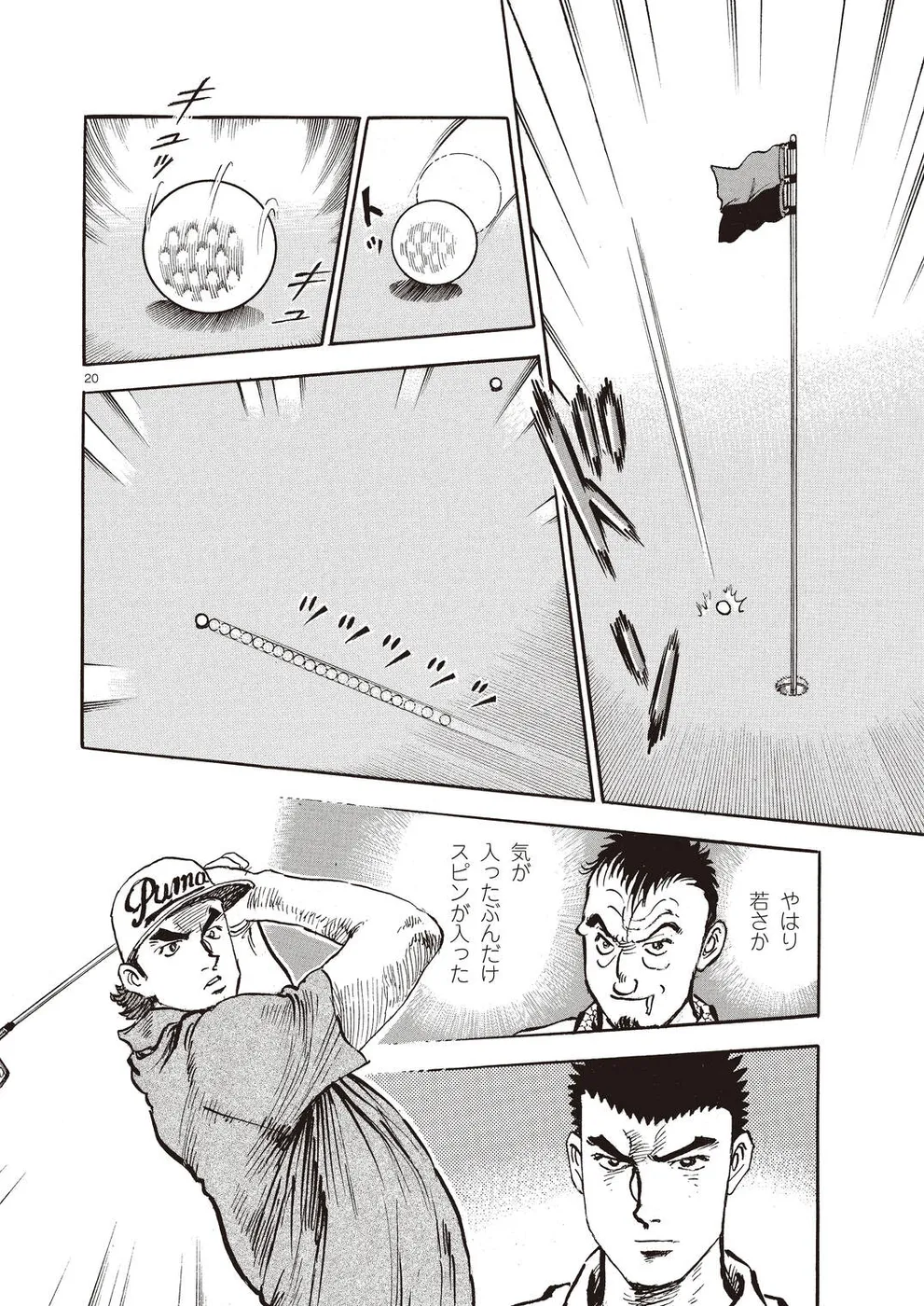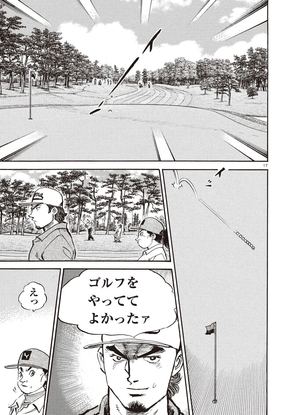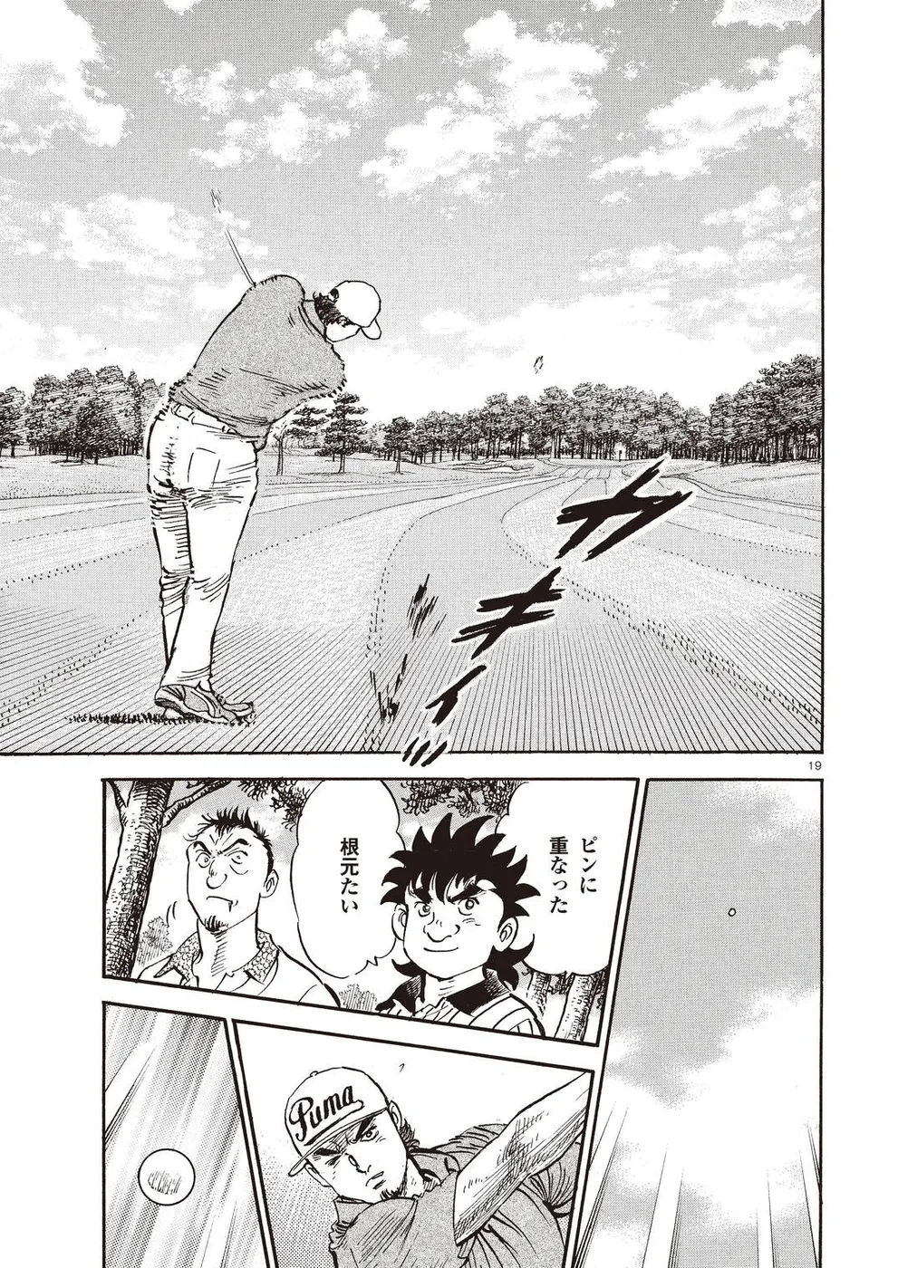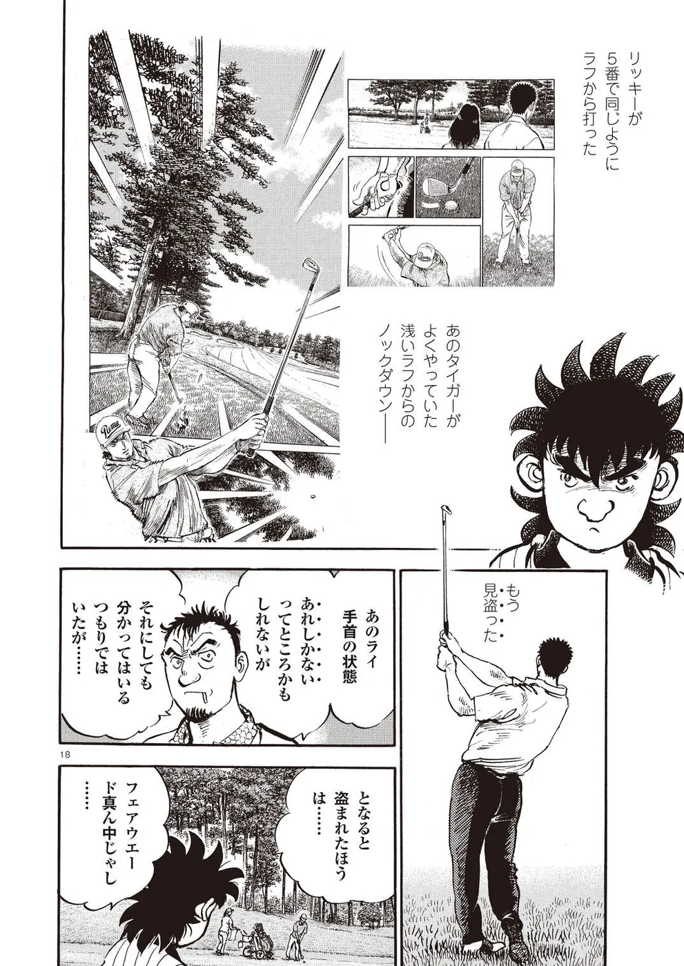 【第68巻あらすじ】刀鍛冶時代に作刀した1本を懸けて、世界ランクトップ10に入るリッキー・ハウラーとマッチプレーを戦うことになった鳴海一丸。さまざまな駆け引きが行われる中、戦いは8番ホールに入って一丸のワンダウン。互角の勝負を続けていたが、7番ホールのセカンドショットで痛めた左手首が、一丸のスイングに影響を与え始めていた…。