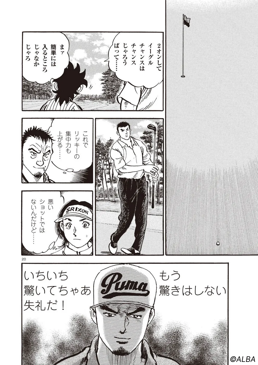 【第68巻あらすじ】刀鍛冶時代に作刀した1本を懸けて、世界ランクトップ10に入るリッキー・ハウラーとマッチプレーを戦うことになった鳴海一丸。さまざまな駆け引きが行われる中、戦いは8番ホールに入って一丸のワンダウン。互角の勝負を続けていたが、7番ホールのセカンドショットで痛めた左手首が、一丸のスイングに影響を与え始めていた…。