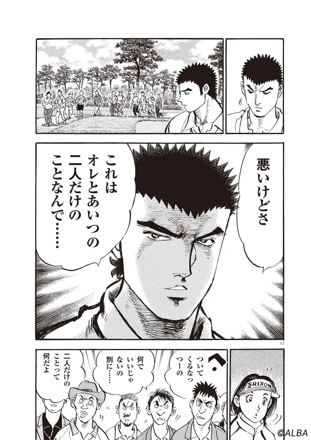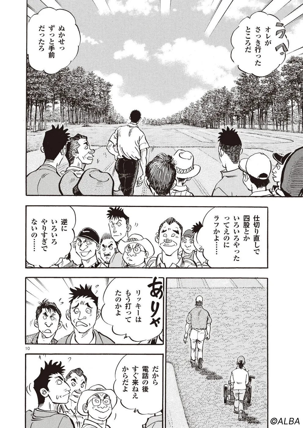 【第68巻あらすじ】刀鍛冶時代に作刀した1本を懸けて、世界ランクトップ10に入るリッキー・ハウラーとマッチプレーを戦うことになった鳴海一丸。さまざまな駆け引きが行われる中、戦いは8番ホールに入って一丸のワンダウン。互角の勝負を続けていたが、7番ホールのセカンドショットで痛めた左手首が、一丸のスイングに影響を与え始めていた…。