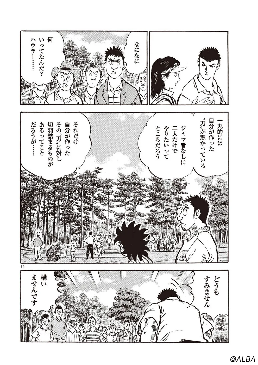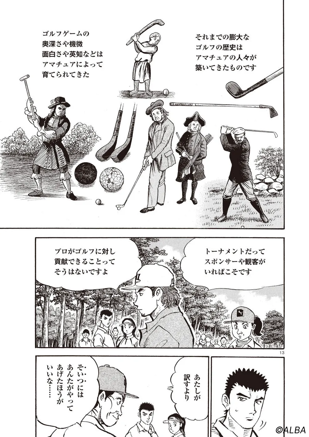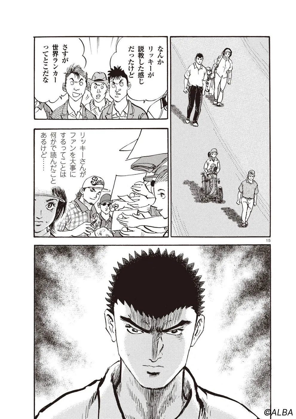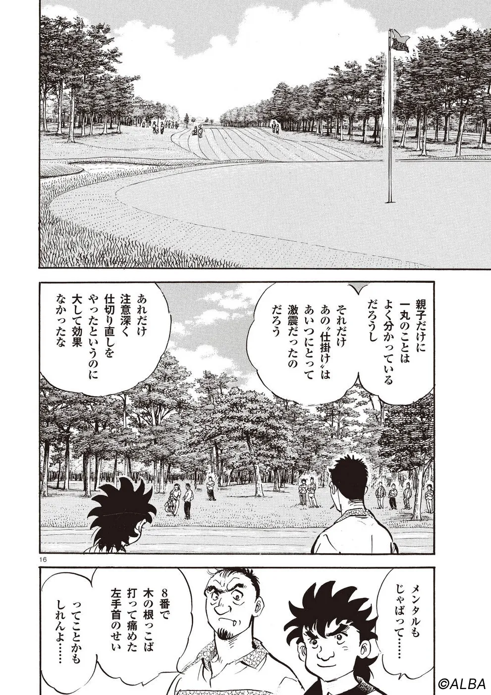 【第68巻あらすじ】刀鍛冶時代に作刀した1本を懸けて、世界ランクトップ10に入るリッキー・ハウラーとマッチプレーを戦うことになった鳴海一丸。さまざまな駆け引きが行われる中、戦いは8番ホールに入って一丸のワンダウン。互角の勝負を続けていたが、7番ホールのセカンドショットで痛めた左手首が、一丸のスイングに影響を与え始めていた…。