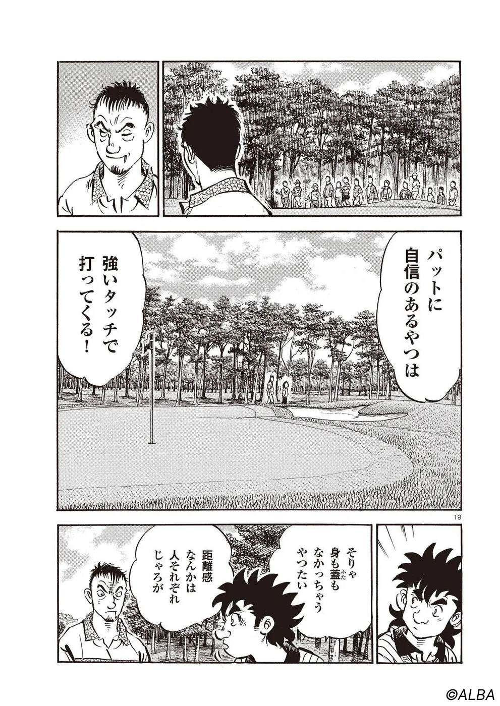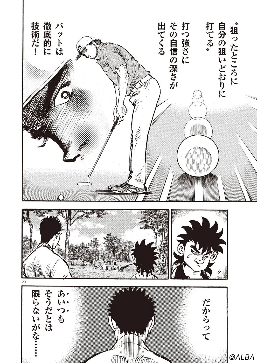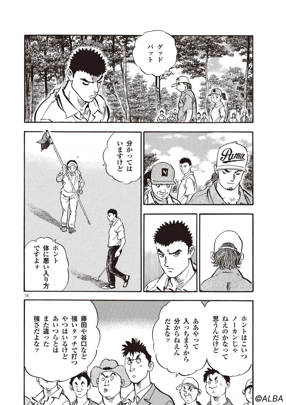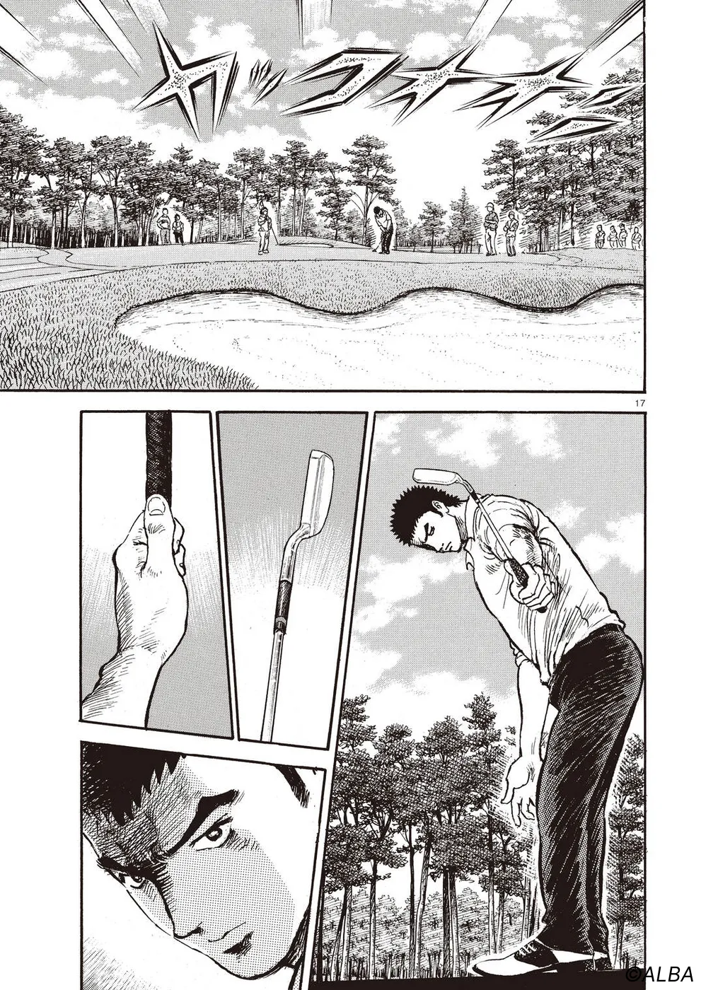 【第68巻あらすじ】刀鍛冶時代に作刀した1本を懸けて、世界ランクトップ10に入るリッキー・ハウラーとマッチプレーを戦うことになった鳴海一丸。さまざまな駆け引きが行われる中、戦いは8番ホールに入って一丸のワンダウン。互角の勝負を続けていたが、7番ホールのセカンドショットで痛めた左手首が、一丸のスイングに影響を与え始めていた…。