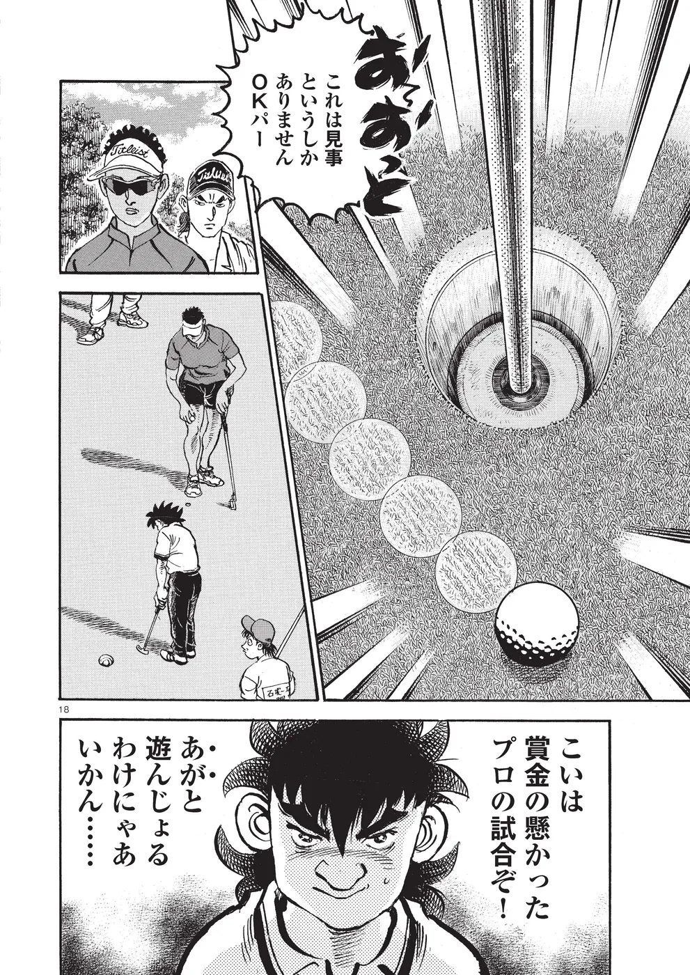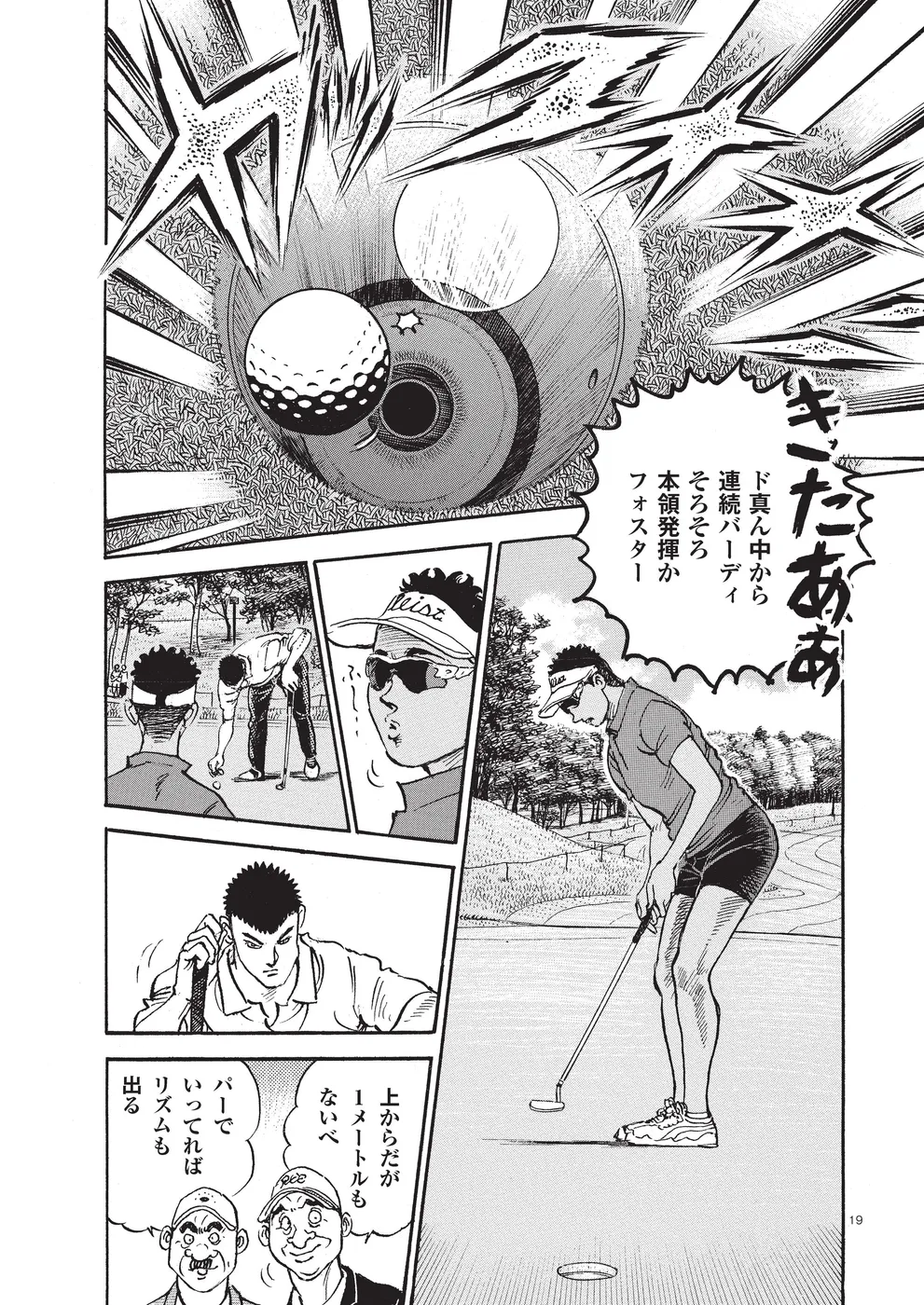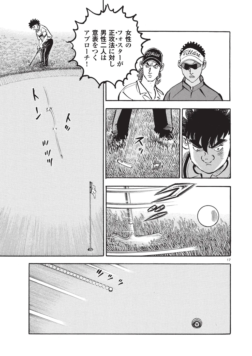 【第72巻あらすじ】ホーライワールドチャンピオンシップに出場した鳴海一丸。招待選手の中には、米国から参戦する元軍人の女子ゴルファー・フォスターがいた。フォスターのキャディを務めるのは競技を引退した鳴海の好敵手・御園聖志だった。初日、フォスターと同組のラウンドとなった鳴海は、御園を意識してしまうのか、マッチプレーのような強引な攻めを続けてしまうが…。