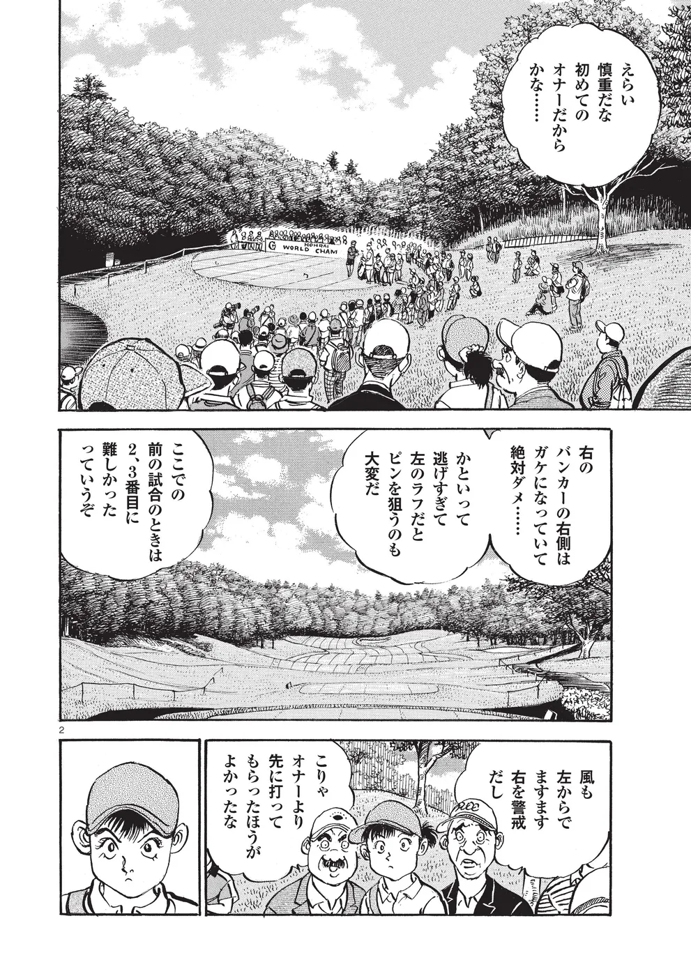 【第72巻あらすじ】ホーライワールドチャンピオンシップに出場した鳴海一丸。招待選手の中には、米国から参戦する元軍人の女子ゴルファー・フォスターがいた。フォスターのキャディを務めるのは競技を引退した鳴海の好敵手・御園聖志だった。初日、フォスターと同組のラウンドとなった鳴海は、御園を意識してしまうのか、マッチプレーのような強引な攻めを続けてしまうが…。