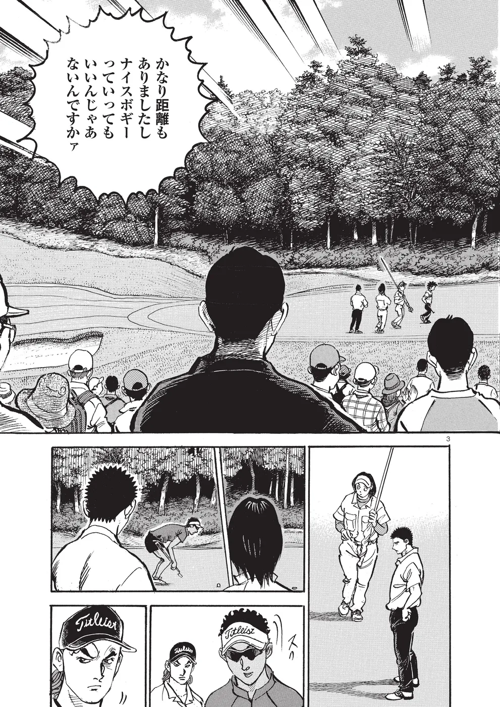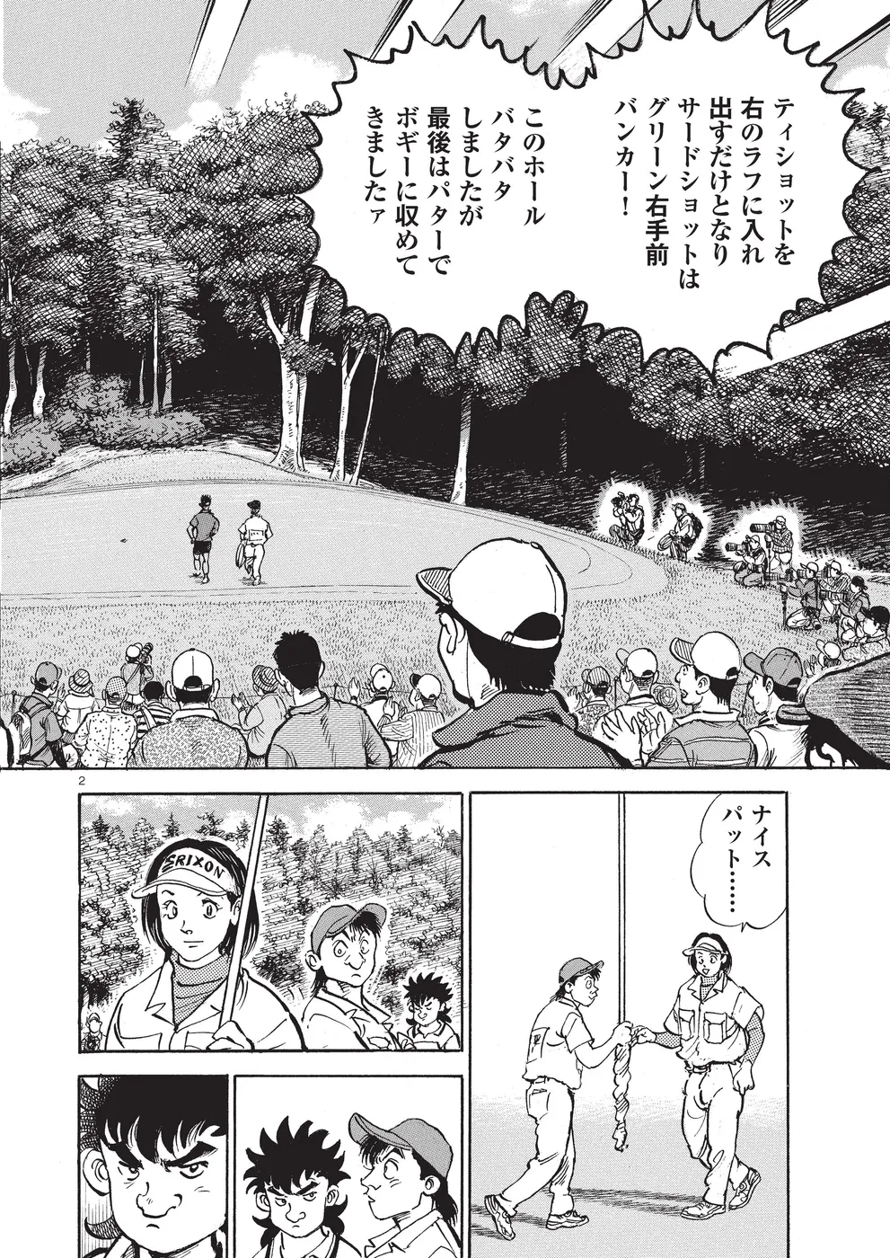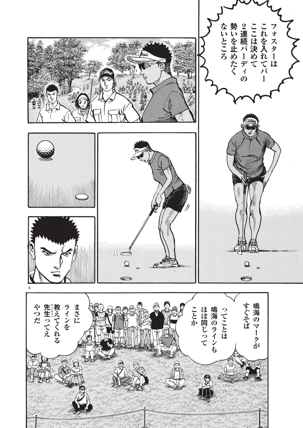 【第72巻あらすじ】ホーライワールドチャンピオンシップに出場した鳴海一丸。招待選手の中には、米国から参戦する元軍人の女子ゴルファー・フォスターがいた。フォスターのキャディを務めるのは競技を引退した鳴海の好敵手・御園聖志だった。初日、フォスターと同組のラウンドとなった鳴海は、御園を意識してしまうのか、マッチプレーのような強引な攻めを続けてしまうが…。