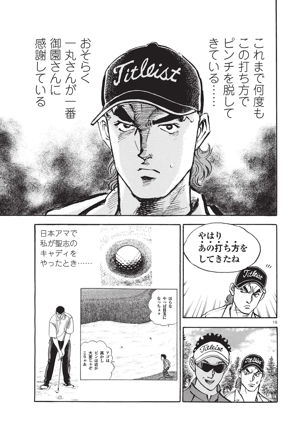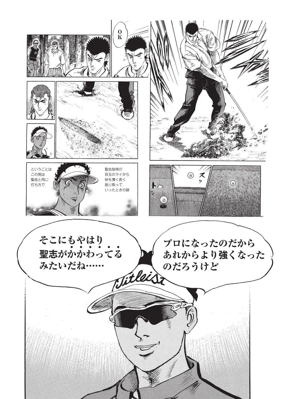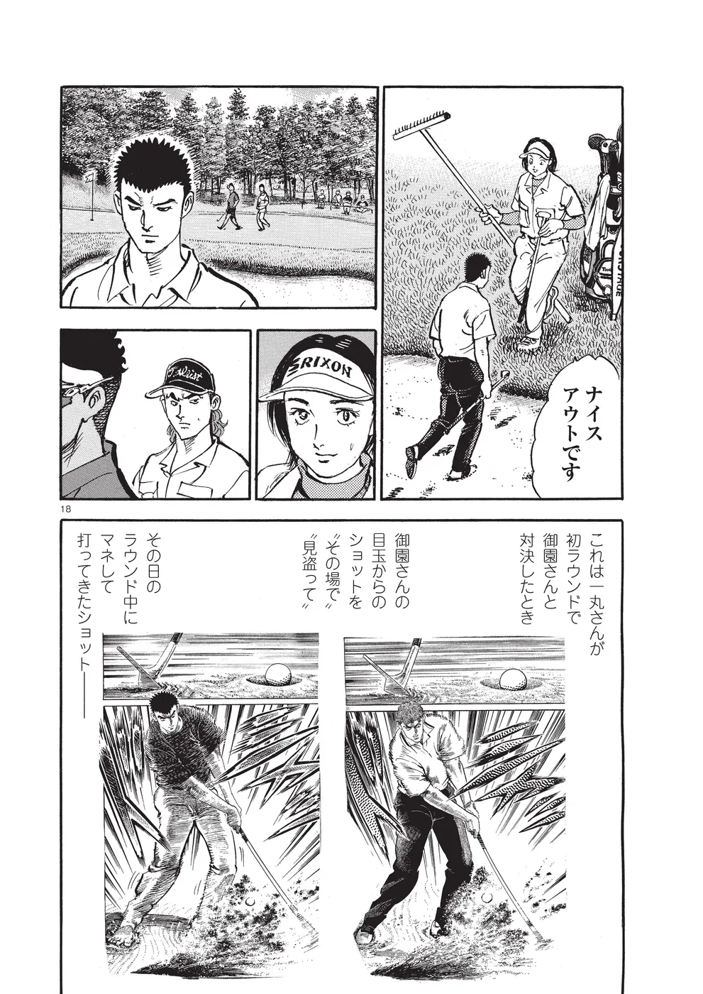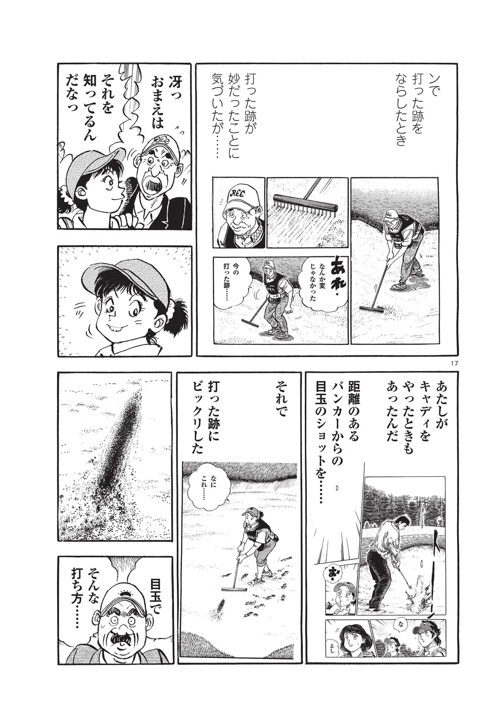 【第72巻あらすじ】ホーライワールドチャンピオンシップに出場した鳴海一丸。招待選手の中には、米国から参戦する元軍人の女子ゴルファー・フォスターがいた。フォスターのキャディを務めるのは競技を引退した鳴海の好敵手・御園聖志だった。初日、フォスターと同組のラウンドとなった鳴海は、御園を意識してしまうのか、マッチプレーのような強引な攻めを続けてしまうが…。