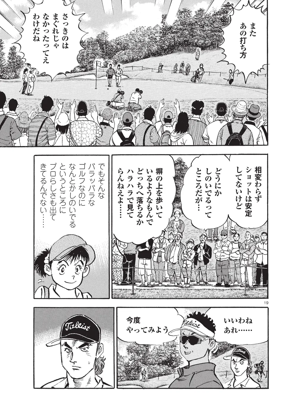 【第72巻あらすじ】ホーライワールドチャンピオンシップに出場した鳴海一丸。招待選手の中には、米国から参戦する元軍人の女子ゴルファー・フォスターがいた。フォスターのキャディを務めるのは競技を引退した鳴海の好敵手・御園聖志だった。初日、フォスターと同組のラウンドとなった鳴海は、御園を意識してしまうのか、マッチプレーのような強引な攻めを続けてしまうが…。