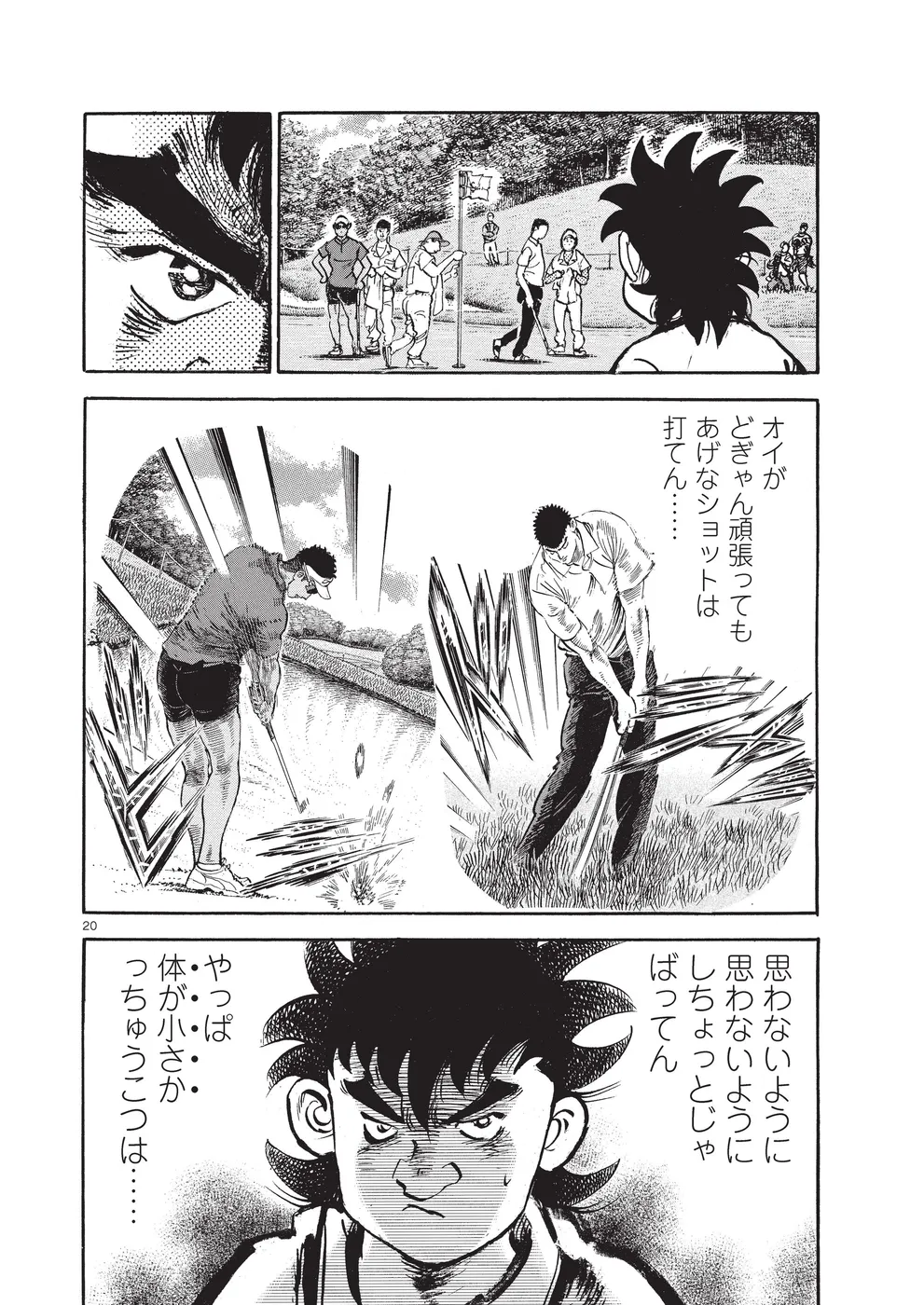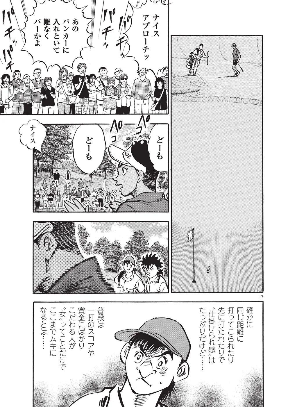 【第72巻あらすじ】ホーライワールドチャンピオンシップに出場した鳴海一丸。招待選手の中には、米国から参戦する元軍人の女子ゴルファー・フォスターがいた。フォスターのキャディを務めるのは競技を引退した鳴海の好敵手・御園聖志だった。初日、フォスターと同組のラウンドとなった鳴海は、御園を意識してしまうのか、マッチプレーのような強引な攻めを続けてしまうが…。