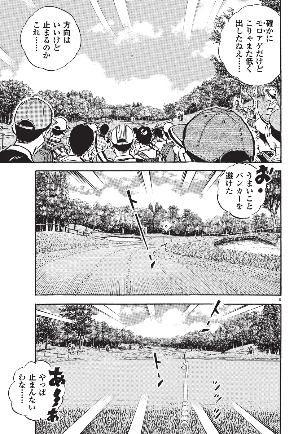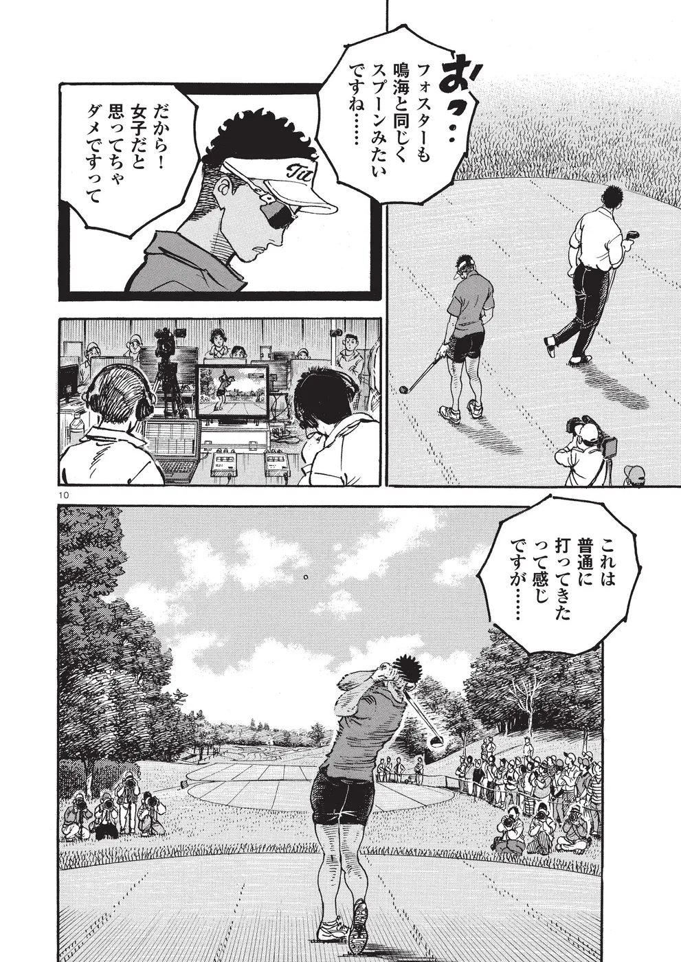 【第72巻あらすじ】ホーライワールドチャンピオンシップに出場した鳴海一丸。招待選手の中には、米国から参戦する元軍人の女子ゴルファー・フォスターがいた。フォスターのキャディを務めるのは競技を引退した鳴海の好敵手・御園聖志だった。初日、フォスターと同組のラウンドとなった鳴海は、御園を意識してしまうのか、マッチプレーのような強引な攻めを続けてしまうが…。