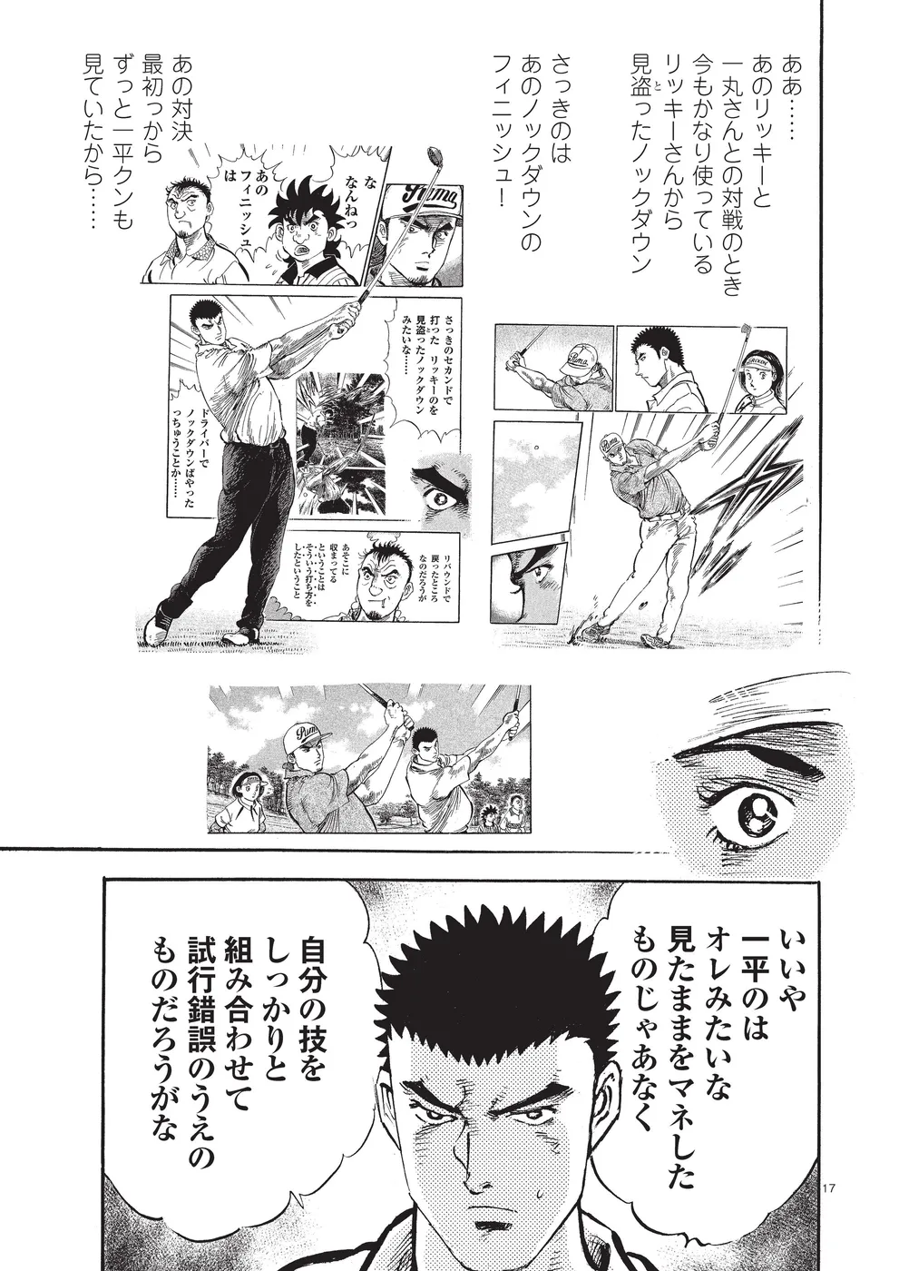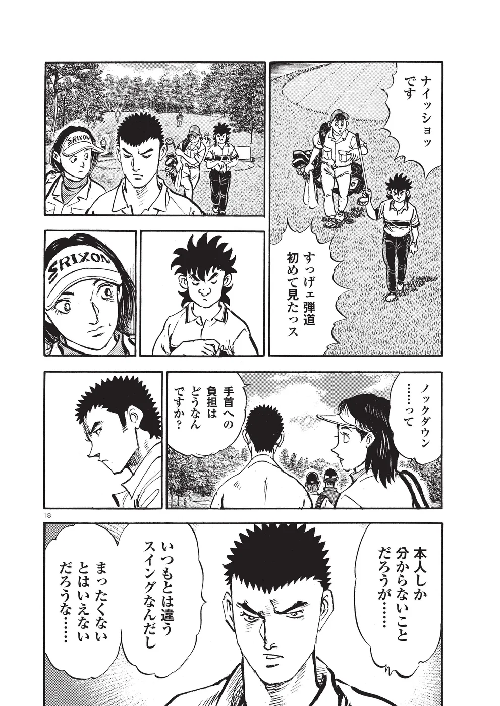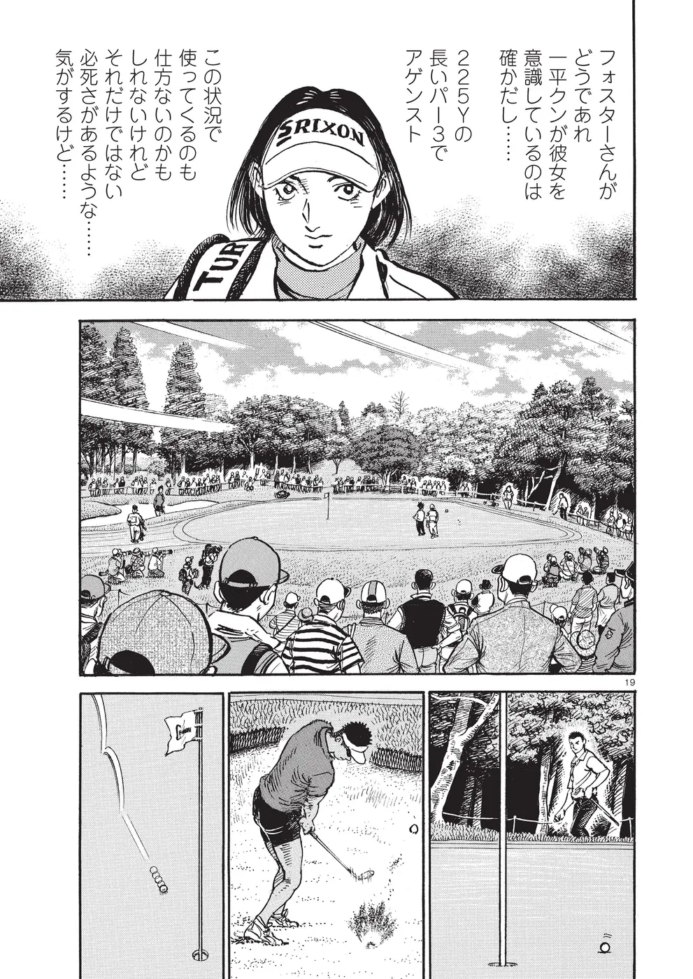【第72巻あらすじ】ホーライワールドチャンピオンシップに出場した鳴海一丸。招待選手の中には、米国から参戦する元軍人の女子ゴルファー・フォスターがいた。フォスターのキャディを務めるのは競技を引退した鳴海の好敵手・御園聖志だった。初日、フォスターと同組のラウンドとなった鳴海は、御園を意識してしまうのか、マッチプレーのような強引な攻めを続けてしまうが…。