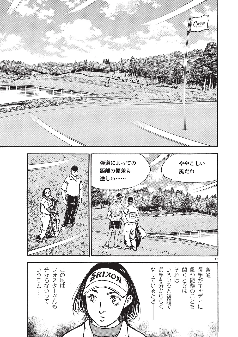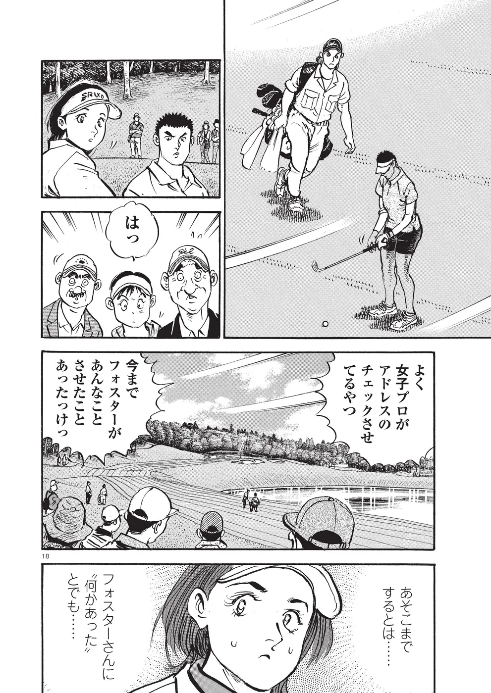 【第74巻あらすじ】ホーライワールドチャンピオンズに出場した鳴海一丸。同組には因縁のライバル御園聖志が鳴海を倒すために送り込んだ刺客、元米国軍人のフォスターが。女性ながらに戦場で狙撃手の観測手の任務に就いていたフォスターは、軍に入る前はトップアマとして活躍していた腕前。互いを強く意識する鳴海とフォスター。予選ラウンドは、まるでマッチプレーの様相を見せていた。