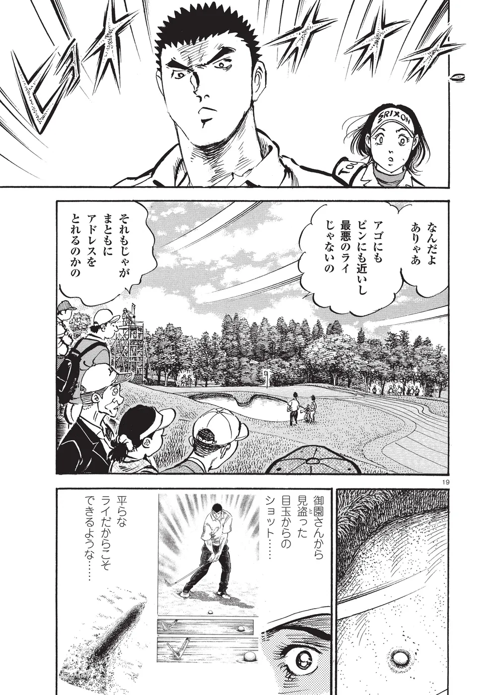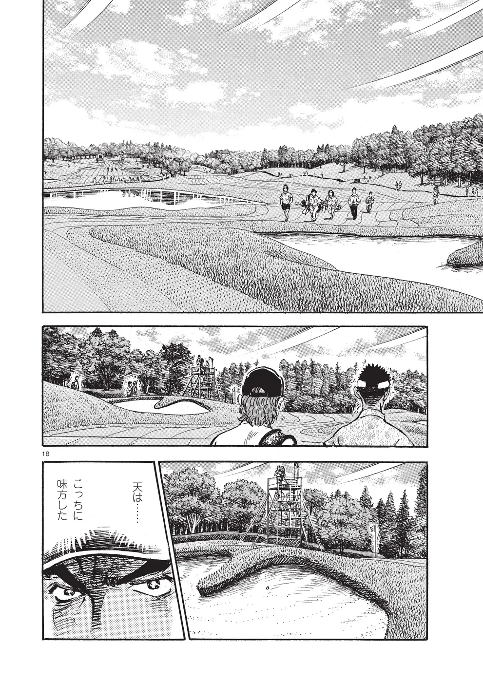 【第74巻あらすじ】ホーライワールドチャンピオンズに出場した鳴海一丸。同組には因縁のライバル御園聖志が鳴海を倒すために送り込んだ刺客、元米国軍人のフォスターが。女性ながらに戦場で狙撃手の観測手の任務に就いていたフォスターは、軍に入る前はトップアマとして活躍していた腕前。互いを強く意識する鳴海とフォスター。予選ラウンドは、まるでマッチプレーの様相を見せていた。