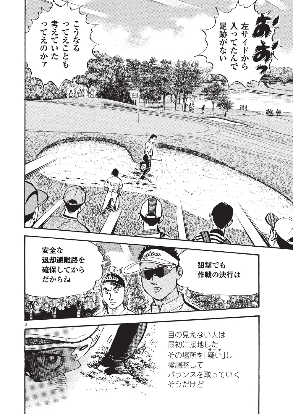 【第74巻あらすじ】ホーライワールドチャンピオンズに出場した鳴海一丸。同組には因縁のライバル御園聖志が鳴海を倒すために送り込んだ刺客、元米国軍人のフォスターが。女性ながらに戦場で狙撃手の観測手の任務に就いていたフォスターは、軍に入る前はトップアマとして活躍していた腕前。互いを強く意識する鳴海とフォスター。予選ラウンドは、まるでマッチプレーの様相を見せていた。