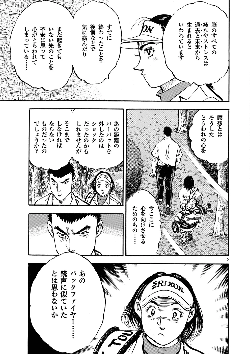 【第75巻あらすじ】ホーライ・ワールド・チャンピオンズ2日目、女子アマチュアゴルファーのロレーナ・フォスターと鳴海一丸の戦いは、マッチプレーの様相を呈する。男子に負けない飛距離を武器に一丸をリードするプレーを見せていたフォスターだったが、米国軍人時代の体験からくる心的外傷後ストレス障害により、微妙にリズムを崩し始めていた。