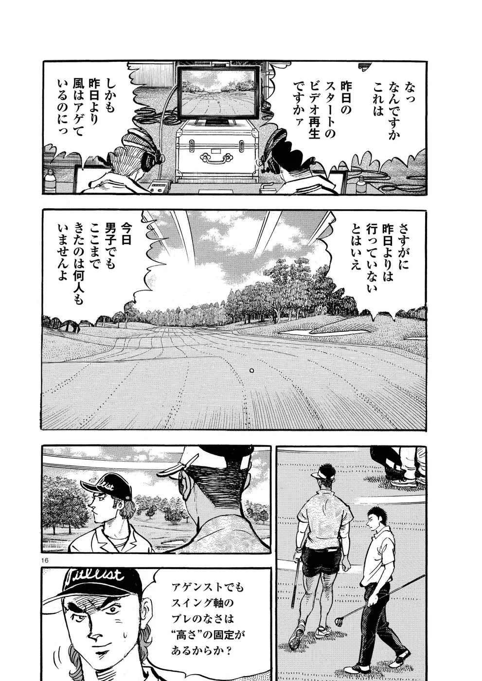 【第75巻あらすじ】ホーライ・ワールド・チャンピオンズ2日目、女子アマチュアゴルファーのロレーナ・フォスターと鳴海一丸の戦いは、マッチプレーの様相を呈する。男子に負けない飛距離を武器に一丸をリードするプレーを見せていたフォスターだったが、米国軍人時代の体験からくる心的外傷後ストレス障害により、微妙にリズムを崩し始めていた。