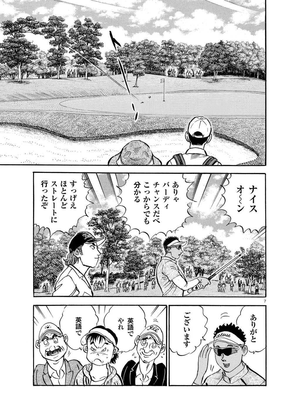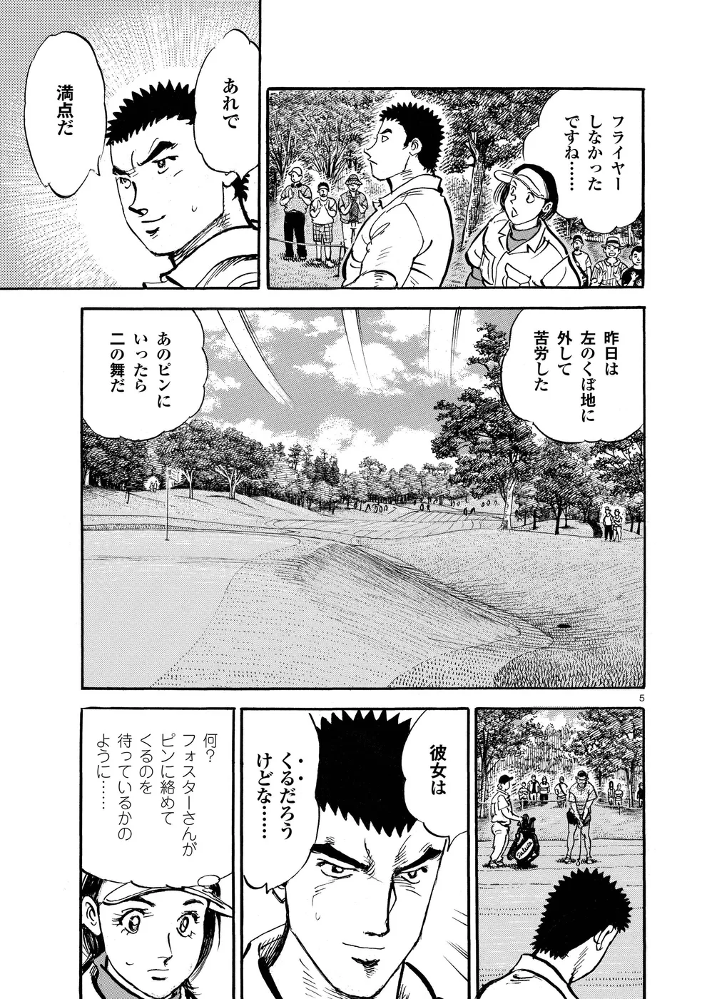 【第75巻あらすじ】ホーライ・ワールド・チャンピオンズ2日目、女子アマチュアゴルファーのロレーナ・フォスターと鳴海一丸の戦いは、マッチプレーの様相を呈する。男子に負けない飛距離を武器に一丸をリードするプレーを見せていたフォスターだったが、米国軍人時代の体験からくる心的外傷後ストレス障害により、微妙にリズムを崩し始めていた。