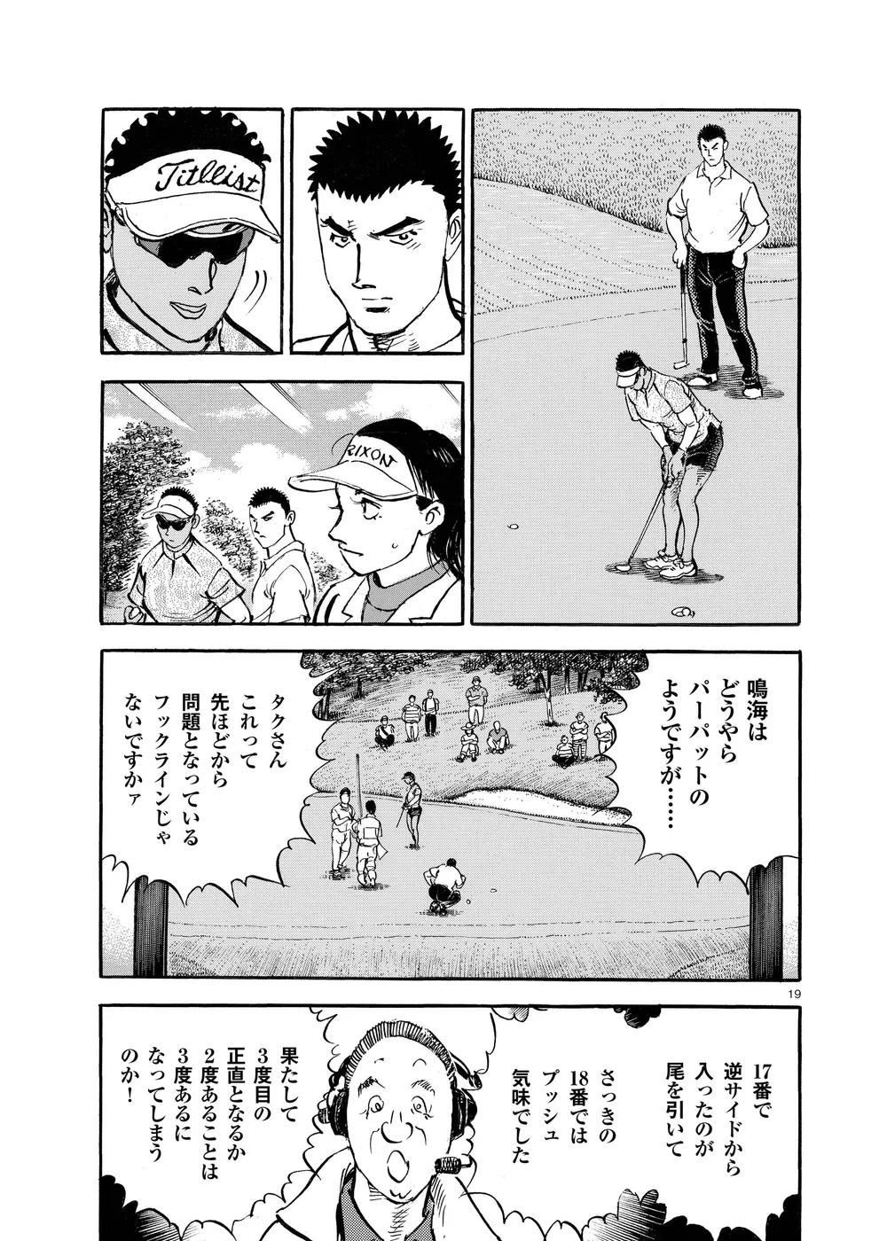 【第75巻あらすじ】ホーライ・ワールド・チャンピオンズ2日目、女子アマチュアゴルファーのロレーナ・フォスターと鳴海一丸の戦いは、マッチプレーの様相を呈する。男子に負けない飛距離を武器に一丸をリードするプレーを見せていたフォスターだったが、米国軍人時代の体験からくる心的外傷後ストレス障害により、微妙にリズムを崩し始めていた。