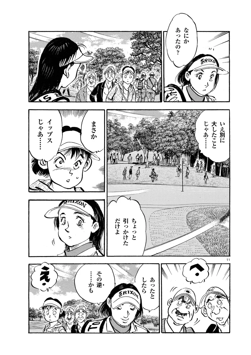 【第75巻あらすじ】ホーライ・ワールド・チャンピオンズ2日目、女子アマチュアゴルファーのロレーナ・フォスターと鳴海一丸の戦いは、マッチプレーの様相を呈する。男子に負けない飛距離を武器に一丸をリードするプレーを見せていたフォスターだったが、米国軍人時代の体験からくる心的外傷後ストレス障害により、微妙にリズムを崩し始めていた。