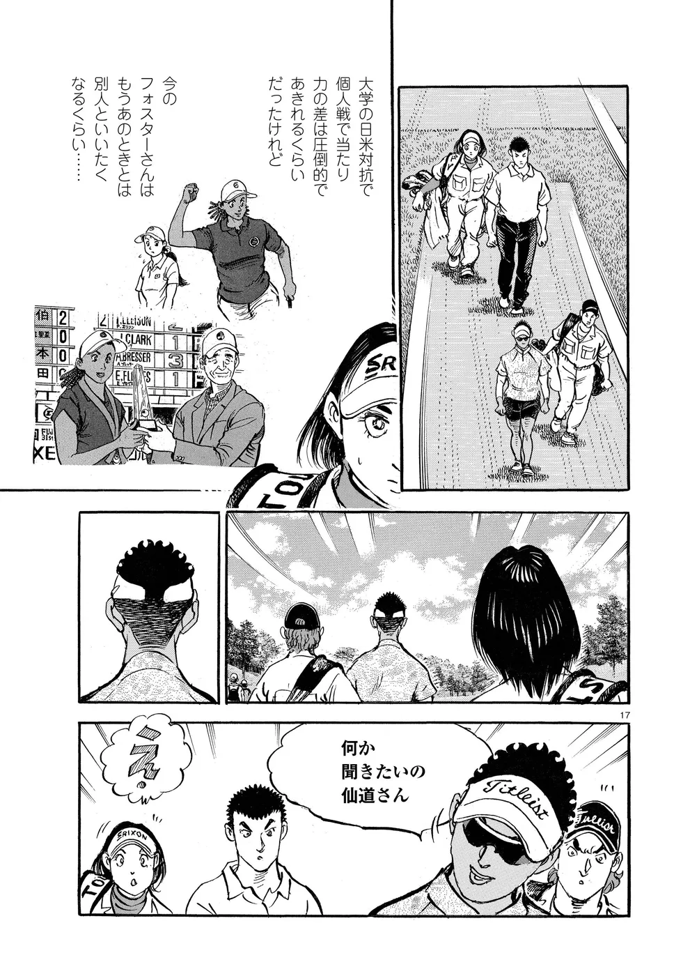【第75巻あらすじ】ホーライ・ワールド・チャンピオンズ2日目、女子アマチュアゴルファーのロレーナ・フォスターと鳴海一丸の戦いは、マッチプレーの様相を呈する。男子に負けない飛距離を武器に一丸をリードするプレーを見せていたフォスターだったが、米国軍人時代の体験からくる心的外傷後ストレス障害により、微妙にリズムを崩し始めていた。