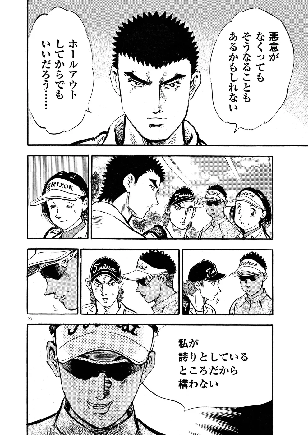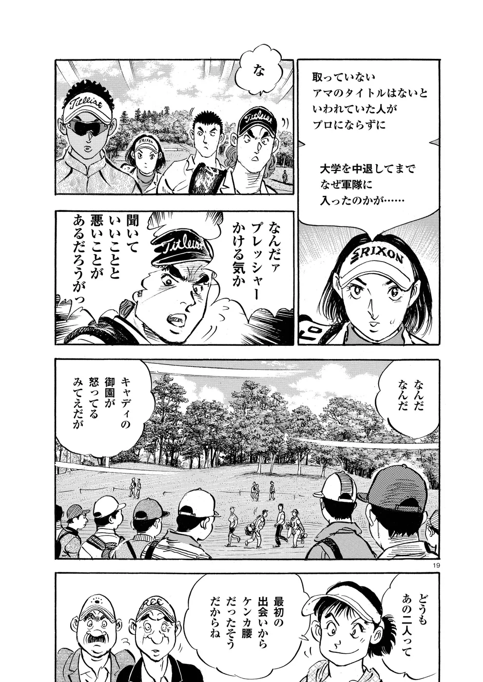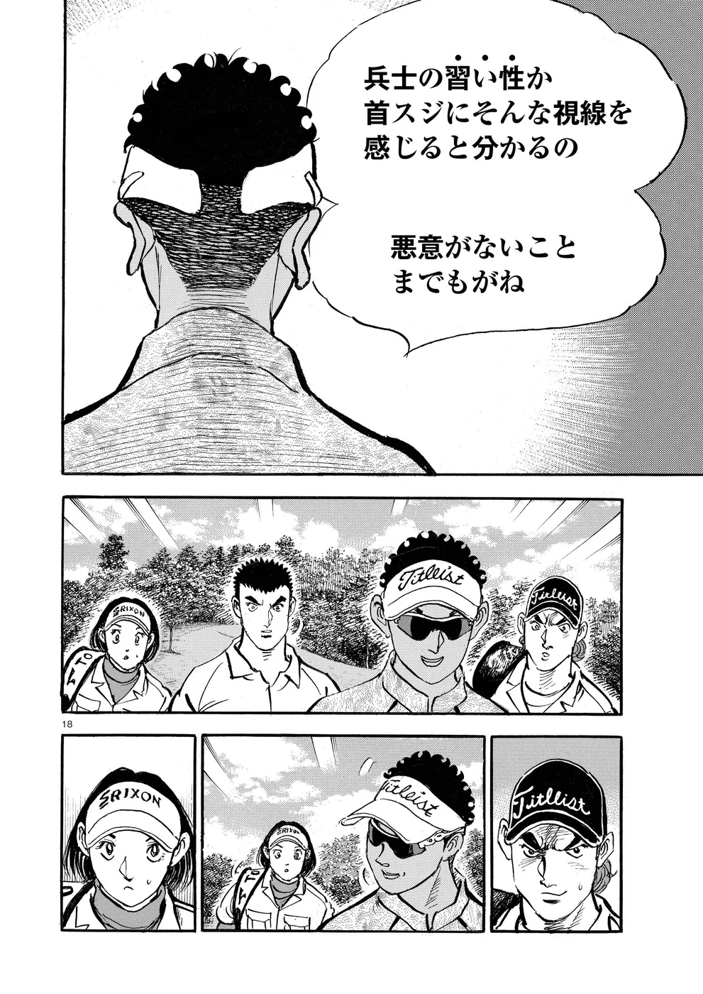 【第75巻あらすじ】ホーライ・ワールド・チャンピオンズ2日目、女子アマチュアゴルファーのロレーナ・フォスターと鳴海一丸の戦いは、マッチプレーの様相を呈する。男子に負けない飛距離を武器に一丸をリードするプレーを見せていたフォスターだったが、米国軍人時代の体験からくる心的外傷後ストレス障害により、微妙にリズムを崩し始めていた。