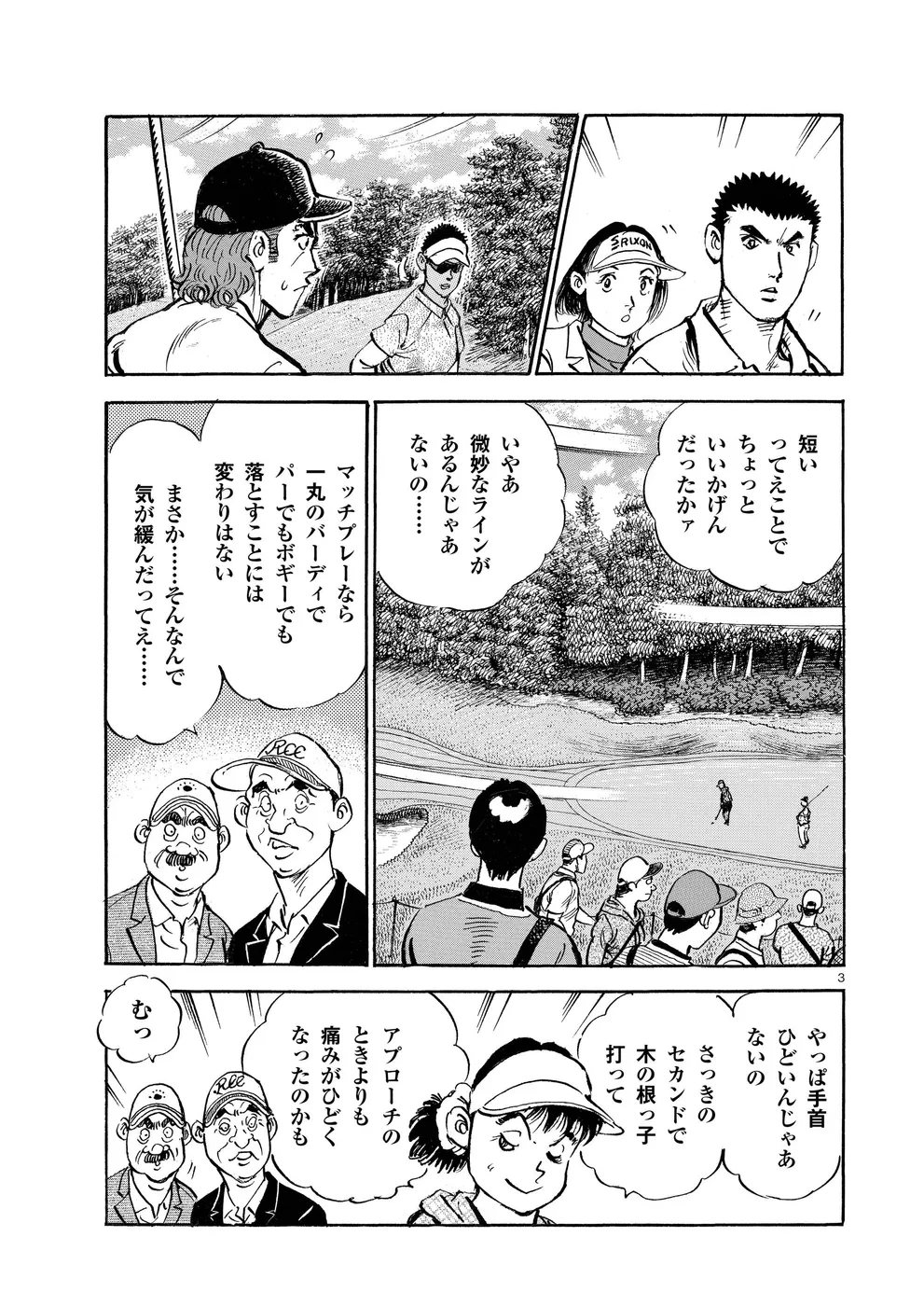 【第76巻あらすじ】ホーライワールドチャンピオンズで鳴海一丸と同組を回る米国人女子アマ・フォスターは、米軍で狙撃観測種を任じられていた帰還兵だった。フォスターと鳴海は、マッチプレーの様相を見せる激しい戦いを展開。だが、車の大きなクラクションの音を聞いた後から、フォスターのショットが乱れ始めた。フォスターは心的外傷後ストレス障害(PTSD)を抱えていた…。
